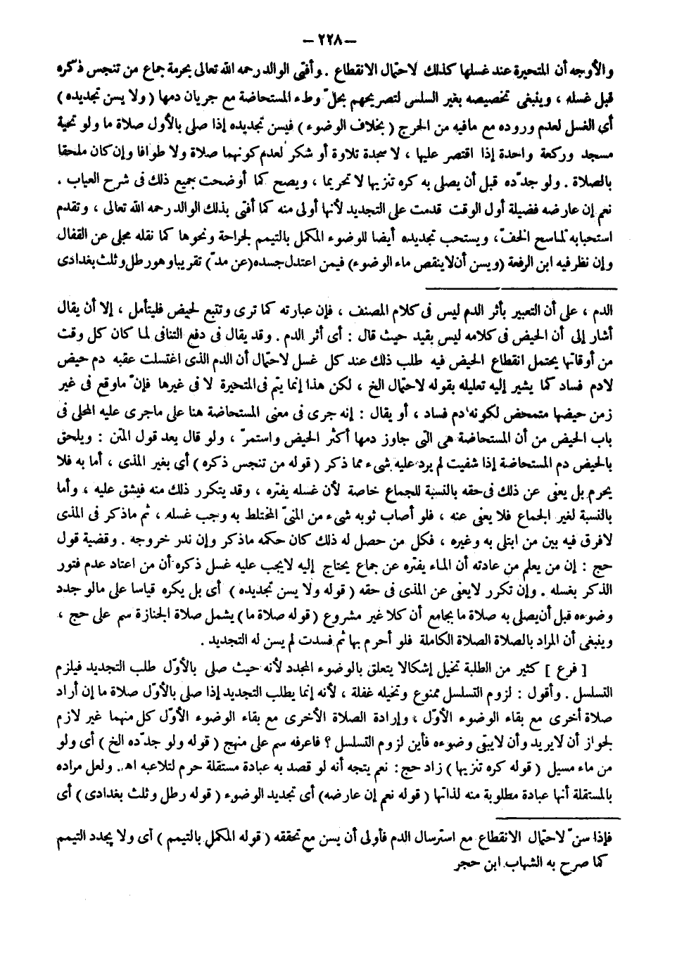 وَقَدْ يُقَالُ فِي دَفْعِ التَّنَافِي لَمَّا كَانَ كُلُّ وَقْتٍ مِنْ أَوْقَاتِهَا يَحْتَمِلُ انْقِطَاعَ الْحَيْضِ فِيهِ طَلَبَ ذَلِكَ عِنْدَ كُلِّ غُسْلٍ لِاحْتِمَالِ أَنَّ الدَّمَ الَّذِي اغْتَسَلَتْ عَقِبَهُ دَمُ حَيْضٍ لَا دَمُ فَسَادٍ كَمَا يُشِيرُ إلَيْهِ تَعْلِيلُهُ بِقَوْلِهِ: لِاحْتِمَالِ إلَخْ، لَكِنَّ هَذَا إنَّمَا يَتِمُّ فِي الْمُتَحَيِّرَةِ لَا فِي غَيْرِهَا فَإِنَّ مَا وَقَعَ فِي غَيْرِ زَمَنِ حَيْضِهَا مُتَمَحَّضٌ لِكَوْنِهِ دَمَ فَسَادٍ، أَوْ يُقَالُ: إنَّهُ جَرَى فِي مَعْنَى الْمُسْتَحَاضَةِ هُنَا عَلَى مَا جَرَى عَلَيْهِ الْمَحَلِّيُّ فِي بَابِ الْحَيْضِ مِنْ أَنَّ الْمُسْتَحَاضَةَ هِيَ الَّتِي جَاوَزَ دَمُهَا أَكْثَرَ الْحَيْضِ وَاسْتَمَرَّ، وَلَوْ قَالَ بَعْدَ قَوْلِ الْمَتْنِ: وَيَلْحَقُ بِالْحَيْضِ دَمُ الْمُسْتَحَاضَةِ إذَا شُفِيَتْ لَمْ يَرُدَّ عَلَيْهِ شَيْءٌ مِمَّا ذُكِرَ (قَوْلُهُ: مَنْ تَنَجَّسَ ذَكَرُهُ) أَيْ بِغَيْرِ الْمَذْيِ، أَمَّا بِهِ فَلَا يَحْرُمُ بَلْ يُعْفَى عَنْ ذَلِكَ فِي حَقِّهِ بِالنِّسْبَةِ لِلْجِمَاعِ خَاصَّةً لِأَنَّ غَسْلَهُ يُفَتِّرُهُ، وَقَدْ يَتَكَرَّرُ ذَلِكَ مِنْهُ فَيَشُقُّ عَلَيْهِ، وَأَمَّا بِالنِّسْبَةِ لِغَيْرِ الْجِمَاعِ فَلَا يُعْفَى عَنْهُ، فَلَوْ أَصَابَ ثَوْبَهُ شَيْءٌ مِنْ الْمَنِيِّ الْمُخْتَلِطِ بِهِ وَجَبَ غَسْلُهُ، ثُمَّ مَا ذُكِرَ فِي الْمَذْيِ لَا فَرْقَ فِيهِ بَيْنَ مَنْ اُبْتُلِيَ بِهِ وَغَيْرِهِ، فَكُلُّ مَنْ حَصَلَ لَهُ ذَلِكَ كَانَ حُكْمُهُ مَا ذُكِرَ وَإِنْ نَدَرَ خُرُوجُهُ.