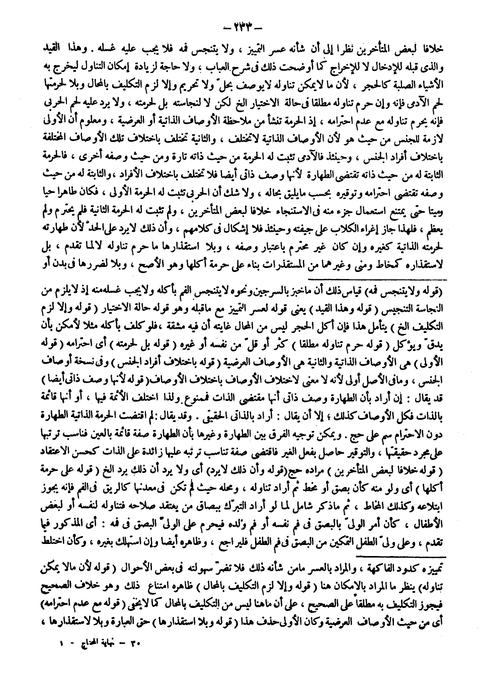 (قَوْلُهُ: حُرِّمَ تَنَاوُلُهُ مُطْلَقًا) كَثُرَ أَوْ قَلَّ مِنْ نَفْسِهِ أَوْ غَيْرِهِ (قَوْلُهُ: بَلْ لِحُرْمَتِهِ) أَيْ احْتِرَامِهِ (قَوْلُهُ: الْأُولَى) هِيَ الْأَوْصَافُ الذَّاتِيَّةُ وَالثَّانِيَةُ هِيَ الْأَوْصَافُ الْعَرَضِيَّةُ (قَوْلُهُ: بِاخْتِلَافِ أَفْرَادِ الْجِنْسِ) وَفِي نُسْخَةٍ: أَوْصَافِ الْجِنْسِ، وَمَا فِي الْأَصْلِ أَوْلَى لِأَنَّهُ لَا مَعْنَى لِاخْتِلَافِ الْأَوْصَافِ بِاخْتِلَافِ الْأَوْصَافِ (قَوْلُهُ: لِأَنَّهَا وَصْفٌ ذَاتِيٌّ أَيْضًا) قَدْ يُقَالُ: إنْ أَرَادَ بِأَنَّ الطَّهَارَةَ وَصْفٌ ذَاتِيٌّ أَنَّهَا مُقْتَضَى الذَّاتِ فَمَمْنُوعٌ وَلِذَا اخْتَلَفَ الْأَئِمَّةُ فِيهَا، أَوْ أَنَّهَا قَائِمَةٌ بِالذَّاتِ فَكُلُّ الْأَوْصَافِ كَذَلِكَ؛ إلَّا أَنْ يُقَالَ: أَرَادَ بِالذَّاتِيِّ الْحَقِيقِيَّ.