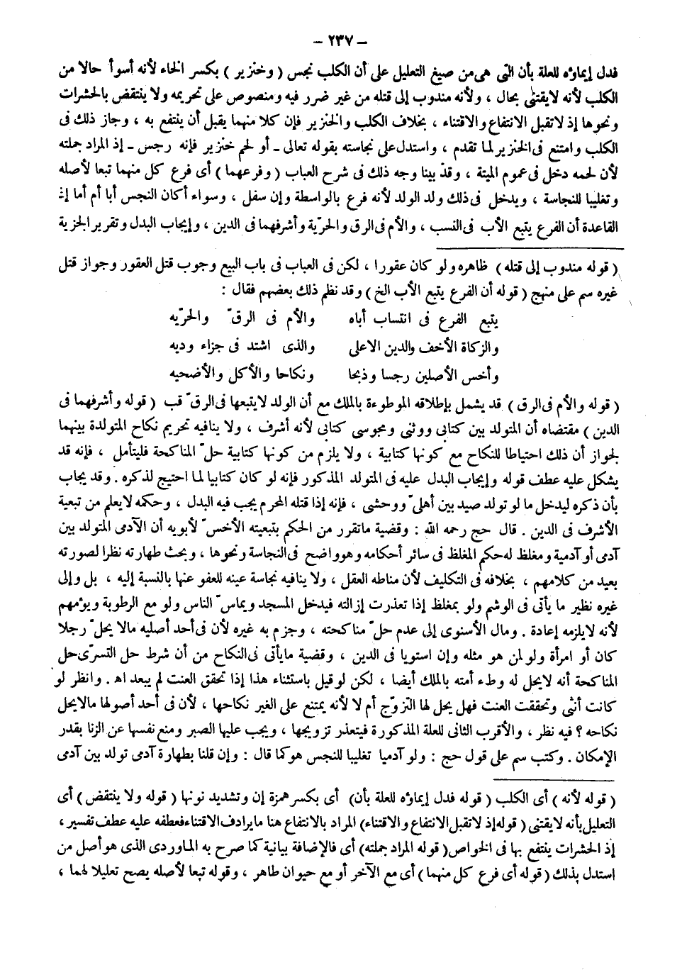 ـــــــــــــــــــــــــــــQقَوْلُهُ: لِأَنَّهُ) أَيْ الْكَلْبَ (قَوْلُهُ: فَدَلَّ إيمَاؤُهُ لِلْعِلَّةِ بِأَنَّ) أَيْ بِكَسْرِ هَمْزَةِ إنَّ وَتَشْدِيدِ نُونِهَا (قَوْلُهُ: وَلَا يُنْتَقَضُ) أَيْ التَّعْلِيلُ بِأَنَّهُ لَا يُقْتَنَى (قَوْلُهُ: إذْ لَا تَقْبَلُ الِانْتِفَاعَ وَالِاقْتِنَاءَ) الْمُرَادُ بِالِانْتِفَاعِ هُنَا مَا يُرَادِفُ الِاقْتِنَاءَ فَعَطَفَهُ عَلَيْهِ عَطْفَ تَفْسِيرٍ، إذْ الْحَشَرَاتُ يُنْتَفَعُ بِهَا فِي الْخَوَاصِّ (قَوْلُهُ: الْمُرَادُ جُمْلَتُهُ) أَيْ: فَالْإِضَافَةُ بَيَانِيَّةٌ كَمَا صَرَّحَ بِهِ الْمَاوَرْدِيُّ الَّذِي هُوَ أَصْلُ مَنْ اسْتَدَلَّ بِذَلِكَ (قَوْلُهُ: أَيْ فَرْعُ كُلٍّ مِنْهُمَا) أَيْ مَعَ الْآخَرِ أَوْ مَعَ حَيَوَانٍ طَاهِرٍ، وَقَوْلُهُ تَبَعًا لِأَصْلِهِ يَصِحُّ تَعْلِيلًا لَهُمَا