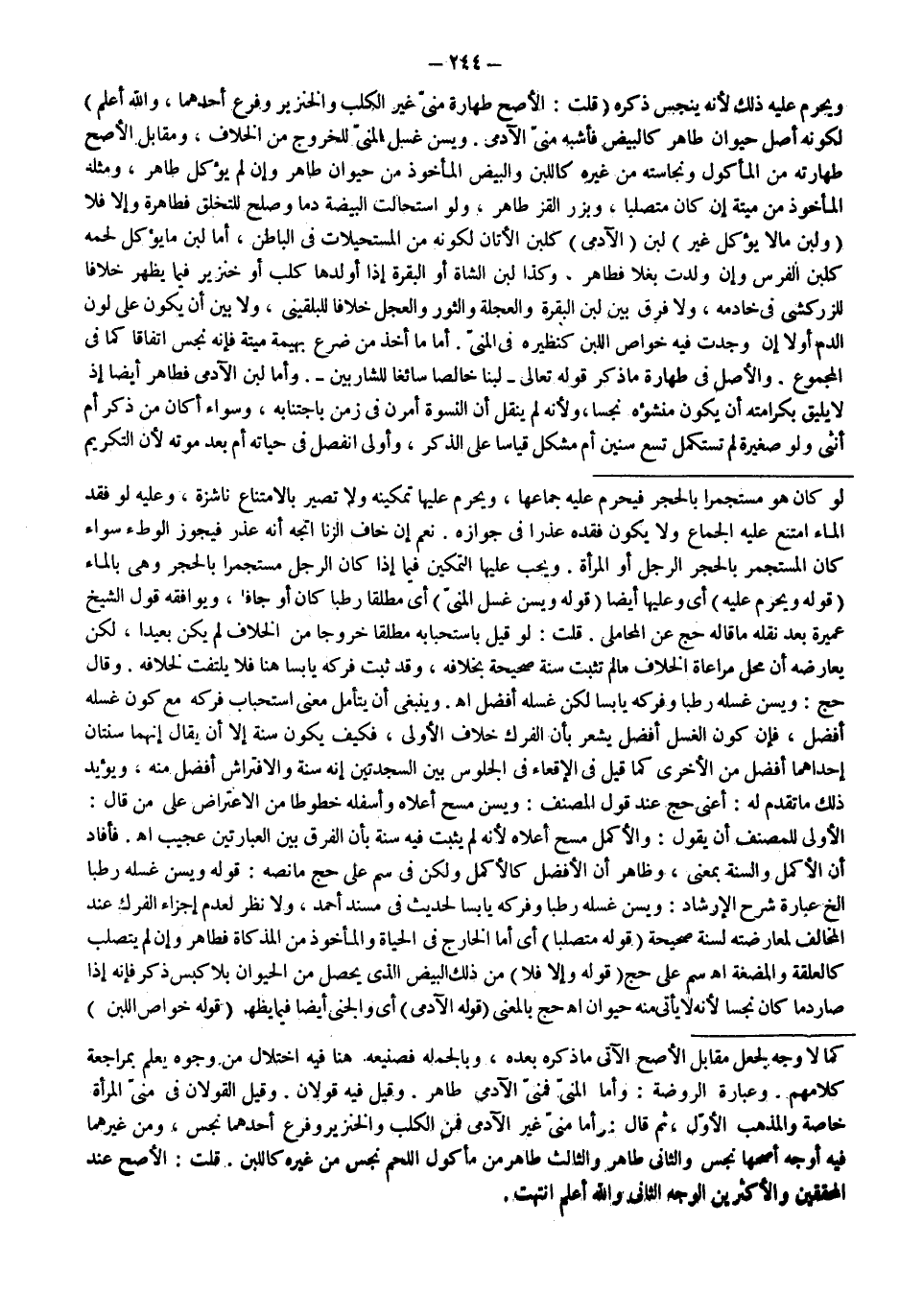 ـــــــــــــــــــــــــــــQكَمَا لَا وَجْهَ لِجَعْلِ مُقَابِلِ الْأَصَحِّ الْآتِي مَا ذَكَرَهُ بَعْدَهُ، وَبِالْجُمْلَةِ فَصَنِيعُهُ. هُنَا فِيهِ اخْتِلَالٌ مِنْ وُجُوهٍ يُعْلَمُ بِمُرَاجَعَةِ كَلَامِهِمْ. وَعِبَارَةُ الرَّوْضَةِ: وَأَمَّا الْمَنِيُّ فَمَنِيُّ الْآدَمِيِّ طَاهِرٌ. وَقِيلَ فِيهِ قَوْلَانِ. وَقِيلَ الْقَوْلَانِ فِي مَنِيِّ الْمَرْأَةِ خَاصَّةً، وَالْمَذْهَبُ الْأَوَّلُ، ثُمَّ قَالَ: وَأَمَّا مَنِيُّ غَيْرِ الْآدَمِيِّ فَمِنْ الْكَلْبِ، وَالْخِنْزِيرِ وَفَرْعُ أَحَدِهِمَا نَجِسٌ، وَمِنْ غَيْرِهِمَا فِيهِ أَوْجُهٌ أَصَحُّهَا نَجِسٌ وَالثَّانِي طَاهِرٌ وَالثَّالِثُ طَاهِرٌ مِنْ مَأْكُولِ اللَّحْمِ نَجِسٌ مِنْ غَيْرِهِ كَاللَّبَنِ. قُلْت: الْأَصَحُّ عِنْدَ الْمُحَقِّقِينَ، وَالْأَكْثَرِينَ الْوَجْهُ الثَّانِي وَاَللَّهُ أَعْلَمُ انْتَهَتْ.