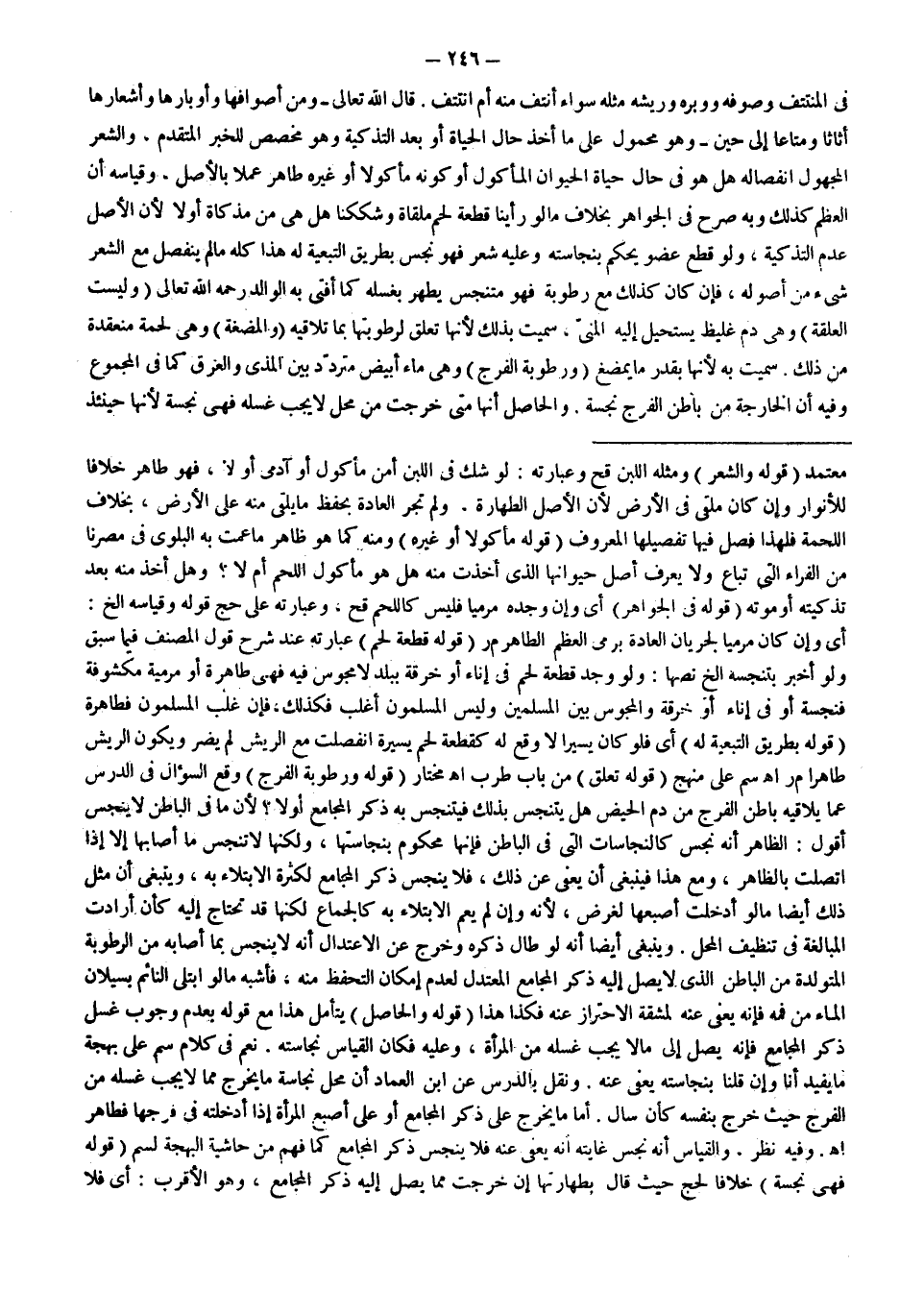قَالَ اللَّهُ تَعَالَى {وَمِنْ أَصْوَافِهَا وَأَوْبَارِهَا وَأَشْعَارِهَا أَثَاثًا وَمَتَاعًا إِلَى حِينٍ} [النحل: 80] وَهُوَ مَحْمُولٌ عَلَى مَا أُخِذَ حَالَ الْحَيَاةِ أَوْ بَعْدَ التَّذْكِيَةِ وَهُوَ مُخَصَّصٌ لِلْخَبَرِ الْمُتَقَدِّمِ، وَالشَّعْرُ الْمَجْهُولُ انْفِصَالُهُ هَلْ هُوَ فِي حَالِ حَيَاةِ الْحَيَوَانِ الْمَأْكُولِ أَوْ كَوْنُهُ مَأْكُولًا أَوْ غَيْرُهُ طَاهِرٌ عَمَلًا بِالْأَصْلِ، وَقِيَاسُهُ أَنَّ الْعَظْمَ كَذَلِكَ وَبِهِ صَرَّحَ فِي الْجَوَاهِرِ بِخِلَافِ مَا لَوْ رَأَيْنَا قِطْعَةَ لَحْمٍ مُلْقَاةٍ وَشَكَكْنَا هَلْ هِيَ مِنْ مُذَكَّاةٍ أَوْ لَا لِأَنَّ الْأَصْلَ عَدَمُ التَّذْكِيَةِ، وَلَوْ قُطِعَ عُضْوٌ يُحْكَمُ بِنَجَاسَتِهِ وَعَلَيْهِ شَعْرٌ فَهُوَ نَجِسٌ بِطَرِيقِ التَّبَعِيَّةِ لَهُ هَذَا كُلُّهُ مَا لَمْ يَنْفَصِلْ مَعَ الشَّعْرِ شَيْءٌ مِنْ أُصُولِهِ، فَإِنْ كَانَ كَذَلِكَ مَعَ رُطُوبَةٍ فَهُوَ مُتَنَجِّسٌ يَطْهُرُ بِغَسْلِهِ كَمَا أَفْتَى بِهِ الْوَالِدُ - رَحِمَهُ اللَّهُ تَعَالَى -.