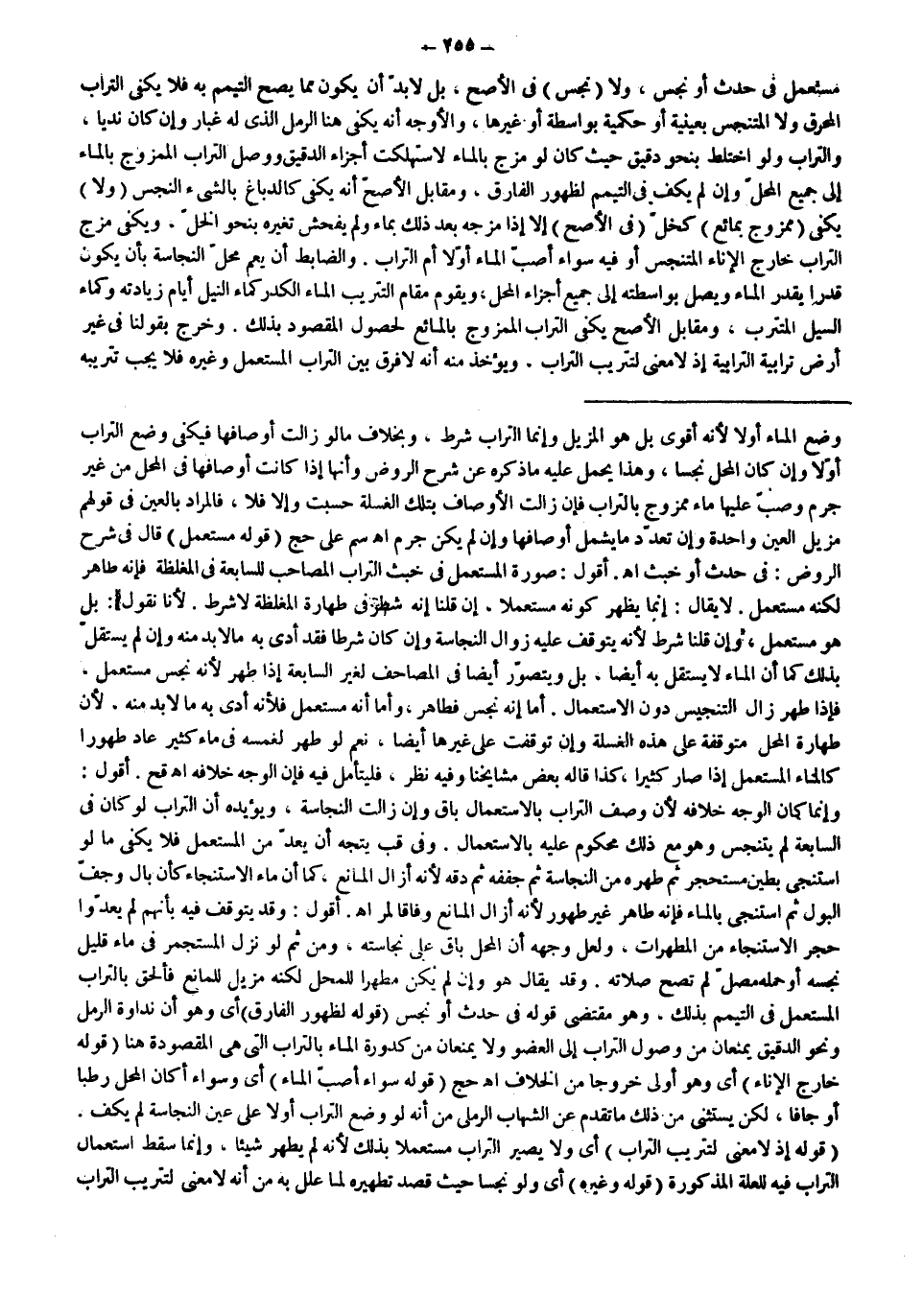 وَفِي قب يَتَّجِهُ أَنْ يُعَدَّ مِنْ الْمُسْتَعْمَلِ فَلَا يَكْفِي مَا لَوْ اسْتَنْجَى بِطِينٍ مُسْتَحْجِرٍ ثُمَّ طَهَّرَهُ مِنْ النَّجَاسَةِ ثُمَّ جَفَّفَهُ ثُمَّ دَقَّهُ لِأَنَّهُ أَزَالَ الْمَانِعَ، كَمَا أَنَّ مَاءَ الِاسْتِنْجَاءِ كَأَنْ بَالَ وَجَفَّ الْبَوْلُ ثُمَّ اسْتَنْجَى بِالْمَاءِ فَإِنَّهُ طَاهِرٌ غَيْرُ طَهُورٍ لِأَنَّهُ أَزَالَ الْمَانِعَ وِفَاقًا لَمْ ر اهـ.