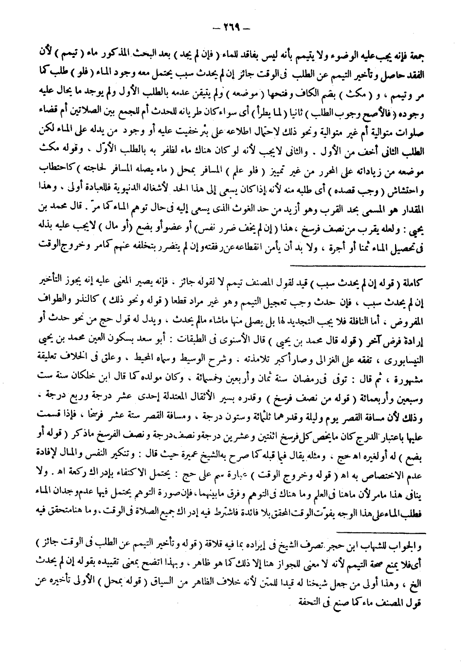 (قَوْلُهُ: قَالَ مُحَمَّدُ بْنُ يَحْيَى) قَالَ الْإِسْنَوِيُّ فِي الطَّبَقَاتِ: أَبُو سَعْدٍ بِسُكُونِ الْعَيْنِ مُحَمَّدُ بْنُ يَحْيَى النَّيْسَابُورِيُّ، تَفَقَّهَ عَلَى الْغَزَالِيِّ وَصَارَ أَكْبَرَ تَلَامِذَتِهِ، وَشَرَحَ الْوَسِيطَ وَسَمَّاهُ الْمُحِيطَ، وَعَلَّقَ فِي الْخِلَافِ تَعْلِيقَةً مَشْهُورَةً، ثُمَّ قَالَ: تُوُفِّيَ فِي رَمَضَانَ سَنَةَ ثَمَانٍ وَأَرْبَعِينَ وَخَمْسِمِائَةٍ، وَكَانَ مَوْلِدُهُ كَمَا قَالَ ابْنُ خِلِّكَانَ سَنَةَ سِتٍّ وَسَبْعِينَ وَأَرْبَعِمِائَةٍ (قَوْلُهُ: مِنْ نِصْفِ فَرْسَخٍ) وَقَدَّرَهُ بِسَيْرِ الْأَثْقَالِ الْمُعْتَدِلَةِ إحْدَى عَشْرَ دَرَجَةً وَرُبْعَ دَرَجَةٍ، وَذَلِكَ لِأَنَّ مَسَافَةَ الْقَصْرِ يَوْمٌ وَلَيْلَةٌ وَقَدْرُهَا ثَلَثُمِائَةٍ وَسِتُّونَ دَرَجَةً، وَمَسَافَةُ الْقَصْرِ سِتَّةَ عَشَرَ فَرْسَخًا، فَإِذَا قُسِمَتْ عَلَيْهَا بِاعْتِبَارِ الدَّرَجِ كَانَ مَا يَخُصُّ كُلُّ فَرْسَخٍ اثْنَتَيْنِ وَعِشْرِينَ دَرَجَةً وَنِصْفَ دَرَجَةٍ وَنِصْفُ الْفَرْسَخِ مَا ذُكِرَ (قَوْلُهُ: أَوْ بِضْعَ) لَهُ أَوْ لِغَيْرِهِ اهـ حَجّ، وَمِثْلُهُ يُقَالُ فِيمَا قَبْلَهُ كَمَا صَرَّحَ بِهِ الشَّيْخُ عَمِيرَةُ حَيْثُ قَالَ: وَتَنْكِيرُ النَّفْسِ وَالْمَالِ لِإِفَادَةِ عَدَمِ الِاخْتِصَاصِ بِهِ اهـ (قَوْلُهُ: وَخُرُوجُ الْوَقْتِ) عِبَارَةُ سم عَلَى حَجّ: يُحْتَمَلُ الِاكْتِفَاءُ بِإِدْرَاكِ رَكْعَةٍ اهـ.