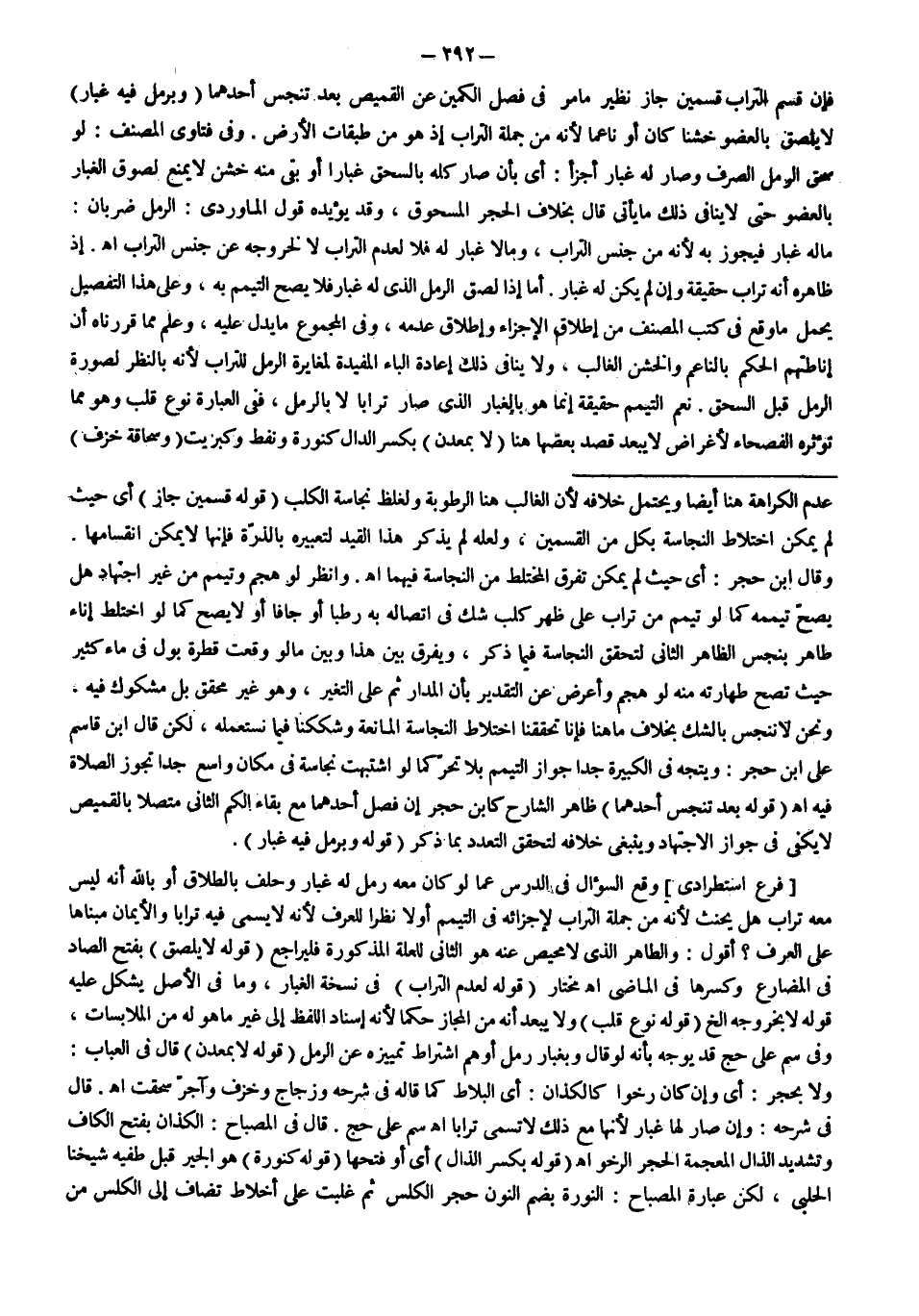 وَانْظُرْ لَوْ هَجَمَ وَتَيَمَّمَ مِنْ غَيْرِ اجْتِهَادٍ هَلْ يَصِحُّ تَيَمُّمُهُ كَمَا لَوْ تَيَمَّمَ مِنْ تُرَابٍ عَلَى ظُهْرِ كَلْبٍ شَكَّ فِي اتِّصَالِهِ بِهِ رَطْبًا أَوْ جَافًّا أَوْ لَا يَصِحُّ كَمَا لَوْ اخْتَلَطَ إنَاءٌ طَاهِرٌ بِنَجِسٍ الظَّاهِرُ الثَّانِي لِتَحَقُّقِ النَّجَاسَةِ فِيمَا ذُكِرَ، وَيُفَرَّقُ بَيْنَ هَذَا وَبَيْنَ مَا لَوْ وَقَعَتْ قَطْرَةُ بَوْلٍ فِي مَاءٍ كَثِيرٍ حَيْثُ تَصِحُّ طَهَارَتُهُ مِنْهُ لَوْ هَجَمَ وَأَعْرَضَ عَنْ التَّقْدِيرِ بِأَنَّ الْمَدَارَ ثَمَّ عَلَى التَّغَيُّرِ، وَهُوَ غَيْرُ مُحَقَّقٍ بَلْ مَشْكُوكٌ فِيهِ، وَنَحْنُ لَا نُنَجِّسُ بِالشَّكِّ بِخِلَافِ مَا هُنَا فَإِنَّا تَحَقَّقْنَا اخْتِلَاطَ النَّجَاسَةِ الْمَانِعَةِ وَشَكَكْنَا فِيمَا نَسْتَعْمِلُهُ، لَكِنْ قَالَ ابْنُ قَاسِمٍ عَلَى ابْنِ حَجَرٍ: وَيُتَّجَهُ فِي الْكَبِيرَةِ جِدًّا جَوَازُ التَّيَمُّمِ بِلَا تَحَرٍّ كَمَا لَوْ اشْتَبَهَتْ نَجَاسَةٌ فِي مَكَان وَاسِعٍ جِدًّا تَجُوزُ الصَّلَاةُ فِيهِ اهـ.