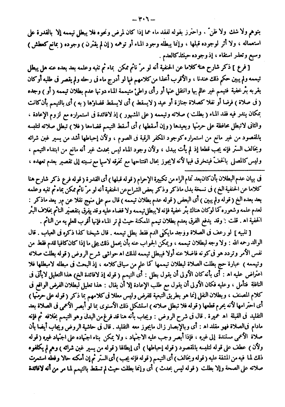 ـــــــــــــــــــــــــــــSفِي بَيَانِ عَدَمِ الْبُطْلَانِ بِأَنْ كَانَ بَعْدَ تَمَامِ الرَّاءِ مِنْ تَكْبِيرَةِ الْإِحْرَامِ (قَوْلُهُ: قَبْلَهَا) أَيْ الْقُدْرَةِ (قَوْلُهُ: فَرْعٌ ذَكَرَ شَارِحٌ هُنَا كَلَامًا عَنْ الْحَنَفِيَّةِ إلَخْ) فِي نُسْخَةٍ بَدَلَ مَا ذَكَرَ وَذَكَرَ بَعْضُ الشُّرَّاحِ عَنْ الْحَنَفِيَّةِ أَنَّهُ لَوْ مَرَّ نَائِمٌ مُمَكَّنٌ بِمَاءٍ ثُمَّ تَنَبَّهَ وَعَلِمَهُ بَعْدَ بُعْدِهِ إلَخْ (قَوْلُهُ: وَلَمْ يُبَيِّنْ) أَيْ الْبَعْضَ (قَوْلُهُ: عَدَمَ بُطْلَانِ تَيَمُّمِهِ) قَالَ سم عَلَى مَنْهَجِ نَقْلًا عَنْ م ر بَعْدَ مَا ذَكَرَ: لِعَدَمِ عِلْمِهِ وَشُعُورِهِ كَمَا لَوْ كَانَ هُنَاكَ بِئْرٌ خَفِيَّةٌ فَإِنَّهُ لَا يَبْطُلُ تَيَمُّمُهُ وَلَا قَضَاءَ عَلَيْهِ وَقَدْ يُفَرَّقُ بِتَقْصِيرِ النَّائِمِ بِخِلَافِ الْبِئْرِ الْخَفِيَّةِ اهـ.