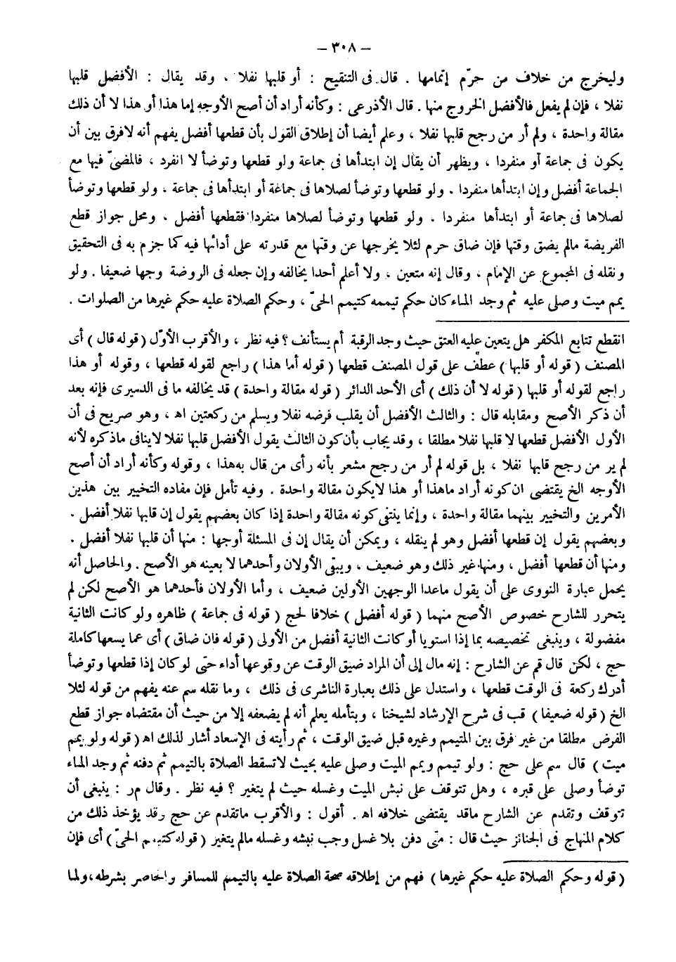قَالَ الْأَذْرَعِيُّ: وَكَأَنَّهُ أَرَادَ أَنَّ أَصَحَّ الْأَوْجُهِ إمَّا هَذَا أَوْ هَذَا لَا أَنَّ ذَلِكَ مَقَالَةٌ وَاحِدَةٌ، وَلَمْ أَرَ مَنْ رَجَّحَ قَلْبَهَا نَفْلًا، وَعُلِمَ أَيْضًا أَنَّ إطْلَاقَ الْقَوْلِ بِأَنَّ قَطْعَهَا أَفْضَلُ يُفْهِمُ أَنَّهُ لَا فَرْقَ بَيْنَ أَنْ يَكُونَ فِي جَمَاعَةٍ أَوْ مُنْفَرِدًا، وَيَظْهَرُ أَنْ يُقَالَ إنْ ابْتَدَأَهَا فِي جَمَاعَةٍ وَلَوْ قَطَعَهَا وَتَوَضَّأَ لَا انْفَرَدَ، فَالْمُضِيُّ فِيهَا مَعَ الْجَمَاعَةِ أَفْضَلُ وَإِنْ ابْتَدَأَهَا مُنْفَرِدًا، وَلَوْ قَطَعَهَا وَتَوَضَّأَ لَصَلَّاهَا فِي جَمَاعَةٍ أَوْ ابْتَدَأَهَا فِي جَمَاعَةٍ، وَلَوْ قَطَعَهَا وَتَوَضَّأَ لَصَلَّاهَا فِي جَمَاعَةٍ أَوْ ابْتَدَأَهَا مُنْفَرِدًا، وَلَوْ قَطَعَهَا وَتَوَضَّأَ لَصَلَّاهَا مُنْفَرِدًا فَقَطْعُهَا أَفْضَلُ، وَمَحَلُّ جَوَازِ قَطْعِ الْفَرِيضَةِ مَا لَمْ يَضِقْ وَقْتُهَا فَإِنْ ضَاقَ حَرُمَ لِئَلَّا يُخْرِجَهَا عَنْ وَقْتِهَا مَعَ قُدْرَتِهِ عَلَى أَدَائِهَا فِيهِ كَمَا جَزَمَ بِهِ فِي التَّحْقِيقِ وَنَقَلَهُ فِي الْمَجْمُوعِ عَنْ الْإِمَامِ، وَقَالَ إنَّهُ مُتَعَيِّنٌ، وَلَا أَعْلَمُ أَحَدًا يُخَالِفُهُ وَإِنْ جَعَلَهُ فِي الرَّوْضَةِ وَجْهًا ضَعِيفًا.