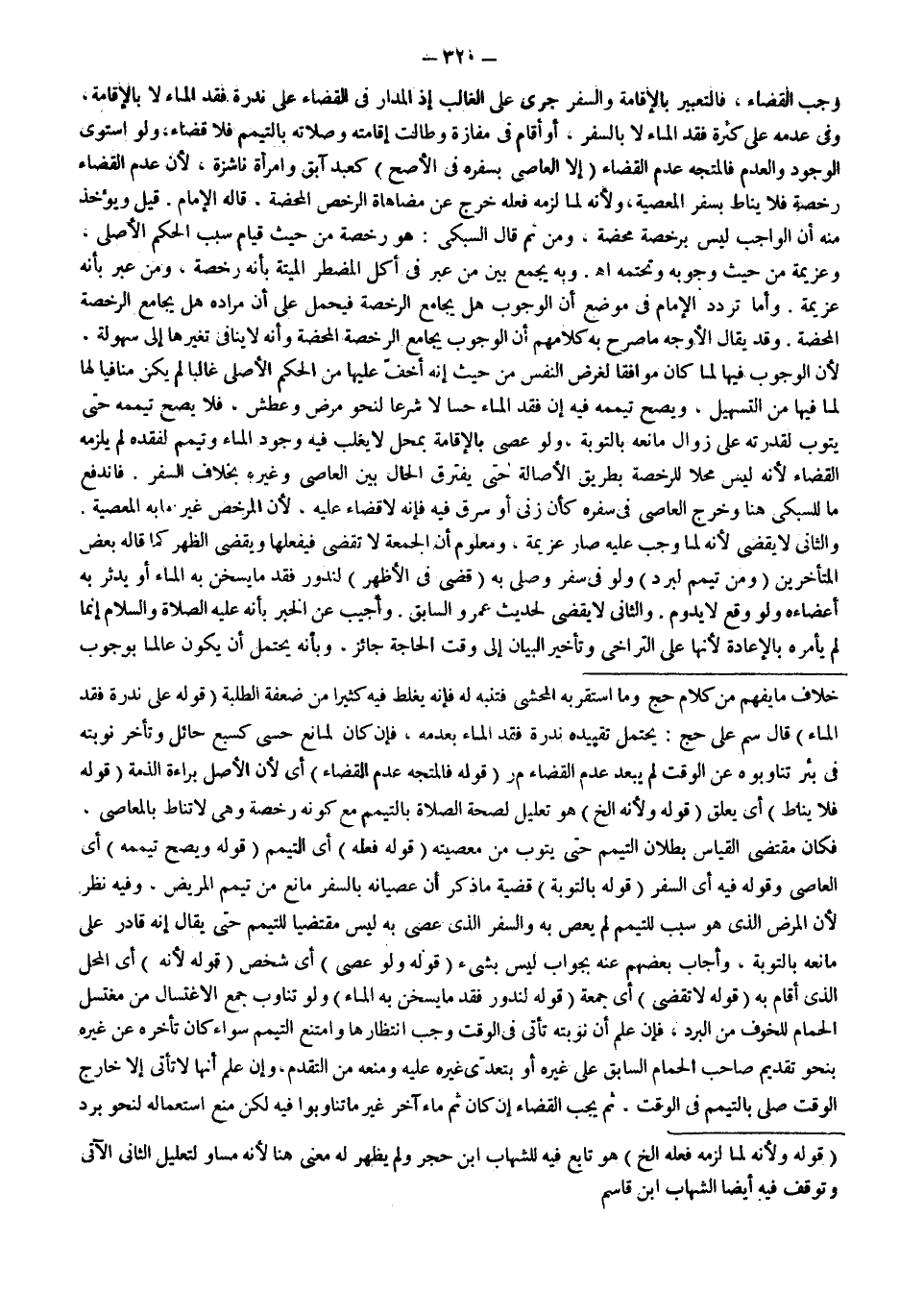 ـــــــــــــــــــــــــــــSخِلَافُ مَا يُفْهَمُ مِنْ كَلَامِ حَجّ وَمَا اسْتَقَرَّ بِهِ الْمُحَشِّي فَتَنَبَّهْ لَهُ فَإِنَّهُ يُغْلَطُ فِيهِ كَثِيرًا مِنْ ضَعَفَةِ الطَّلَبَةِ (قَوْلُهُ: عَلَى نُدْرَةِ فَقْدِ الْمَاءِ) قَالَ سم عَلَى حَجّ: يُحْتَمَلُ تَقْيِيدُهُ نُدْرَةَ فَقْدِ الْمَاءِ بِعَدَمِهِ، فَإِنْ كَانَ لِمَانِعٍ حِسِّيٍّ كَسَبُعٍ حَائِلٍ وَتَأَخُّرِ نَوْبَتِهِ فِي بِئْرٍ تَنَاوَبُوهُ عَنْ الْوَقْتِ لَمْ يَبْعُدْ عَدَمُ الْقَضَاءِ م ر (قَوْلُهُ فَالْمُتَّجَهُ عَدَمُ الْقَضَاءِ) أَيْ لِأَنَّ الْأَصْلَ بَرَاءَةُ الذِّمَّةِ (قَوْلُهُ: فَلَا يُنَاطُ) أَيْ يُعَلَّقُ (قَوْلُهُ: وَلِأَنَّهُ إلَخْ) هُوَ تَعْلِيلٌ لِصِحَّةِ الصَّلَاةِ بِالتَّيَمُّمِ مَعَ كَوْنِهِ رُخْصَةٌ وَهِيَ لَا تُنَاطُ بِالْمَعَاصِي، فَكَانَ مُقْتَضَى الْقِيَاسِ بُطْلَانُ التَّيَمُّمِ حَتَّى يَتُوبَ مِنْ مَعْصِيَتِهِ (قَوْلُهُ: فَعَلَهُ) أَيْ التَّيَمُّمَ (قَوْلُهُ: وَيَصِحُّ تَيَمُّمُهُ) أَيْ الْعَاصِي وَقَوْلُهُ فِيهِ أَيْ السَّفَرِ (قَوْلُهُ: بِالتَّوْبَةِ) قَضِيَّةُ مَا ذُكِرَ أَنَّ عِصْيَانَهُ بِالسَّفَرِ مَانِعٌ مِنْ تَيَمُّمِ الْمَرِيضِ، وَفِيهِ نَظَرٌ لِأَنَّ الْمَرَضَ الَّذِي هُوَ سَبَبٌ لِلتَّيَمُّمِ لَمْ يَعْصِ بِهِ وَالسَّفَرَ الَّذِي عَصَى بِهِ لَيْسَ مُقْتَضِيًا لِلتَّيَمُّمِ حَتَّى يُقَالَ إنَّهُ قَادِرٌ عَلَى مَانِعِهِ بِالتَّوْبَةِ، وَأَجَابَ بَعْضُهُمْ عَنْهُ بِجَوَابٍ لَيْسَ بِشَيْءٍ (قَوْلُهُ وَلَوْ عَصَى) أَيْ شَخْصٌ (قَوْلُهُ: لِأَنَّهُ) أَيْ الْمَحَلُّ الَّذِي أَقَامَ بِهِ (قَوْلُهُ: لَا تُقْضَى) أَيْ جُمُعَةٌ.