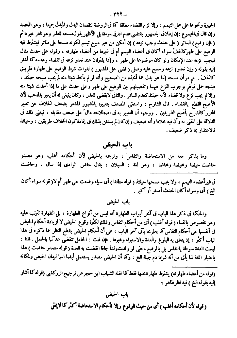 بَابُ الْحَيْضِ وَالْحِكْمَةُ فِي ذِكْرِ هَذَا الْبَابِ فِي آخِرِ أَبْوَابِ الطَّهَارَةِ أَنَّهُ لَيْسَ مِنْ أَنْوَاعِ الطَّهَارَةِ، بَلْ الطَّهَارَةُ تَتَرَتَّبُ عَلَيْهِ وَهُوَ مَخْصُوصٌ بِالنِّسَاءِ (قَوْلُهُ: أَغْلَبُ) أَيْ مِنْ أَحْكَامِ النِّفَاسِ وَذَلِكَ لِكَثْرَةِ وُقُوعِ الْحَيْضِ لَا لِزِيَادَةِ أَحْكَامِ الْحَيْضِ فِي أَنْفُسِهَا عَلَى أَحْكَامِ النِّفَاسِ كَمَا يُعْلَمُ مِمَّا يَأْتِي آخِرَ الْبَابِ، عَلَى أَنَّ أَحْكَامَ الْحَيْضِ بِقَطْعِ النَّظَرِ عَمَّا ذَكَرَهُ فِي هَذَا الْبَابِ أَكْثَرُ، إذْ يَتَعَلَّقُ بِهِ الْبُلُوغُ وَالْعِدَّةُ وَالِاسْتِبْرَاءُ وَغَيْرُهُ.