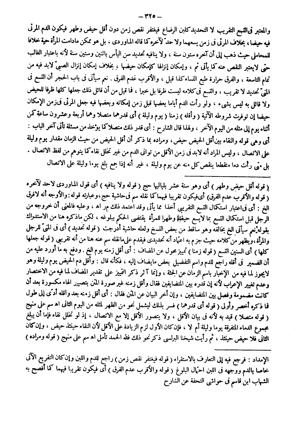 نَعَمْ سَيَأْتِي فِي بَابِ الْحَجْرِ أَنَّ التِّسْعَ فِي الْمَنِيِّ تَحْدِيدٌ لَا تَقْرِيبٌ، وَالتِّسْعُ فِي كَلَامِهِ لَيْسَتْ ظَرْفًا بَلْ خَبَرًا، فَمَا قِيلَ مِنْ أَنَّ قَائِلَ ذَلِكَ جَعَلَهَا كُلَّهَا ظَرْفًا لِلْحَيْضِ وَلَا قَائِلَ بِهِ لَيْسَ بِشَيْءٍ، وَلَوْ رَأَتْ الدَّمَ أَيَّامًا بَعْضَهَا قَبْلَ زَمَنِ إمْكَانِهِ وَبَعْضَهَا فِيهِ جُعِلَ الْمَرْئِيُّ فِي زَمَنِ الْإِمْكَانِ حَيْضًا إنْ تَوَفَّرَتْ شُرُوطُهُ الْآتِيَةُ.