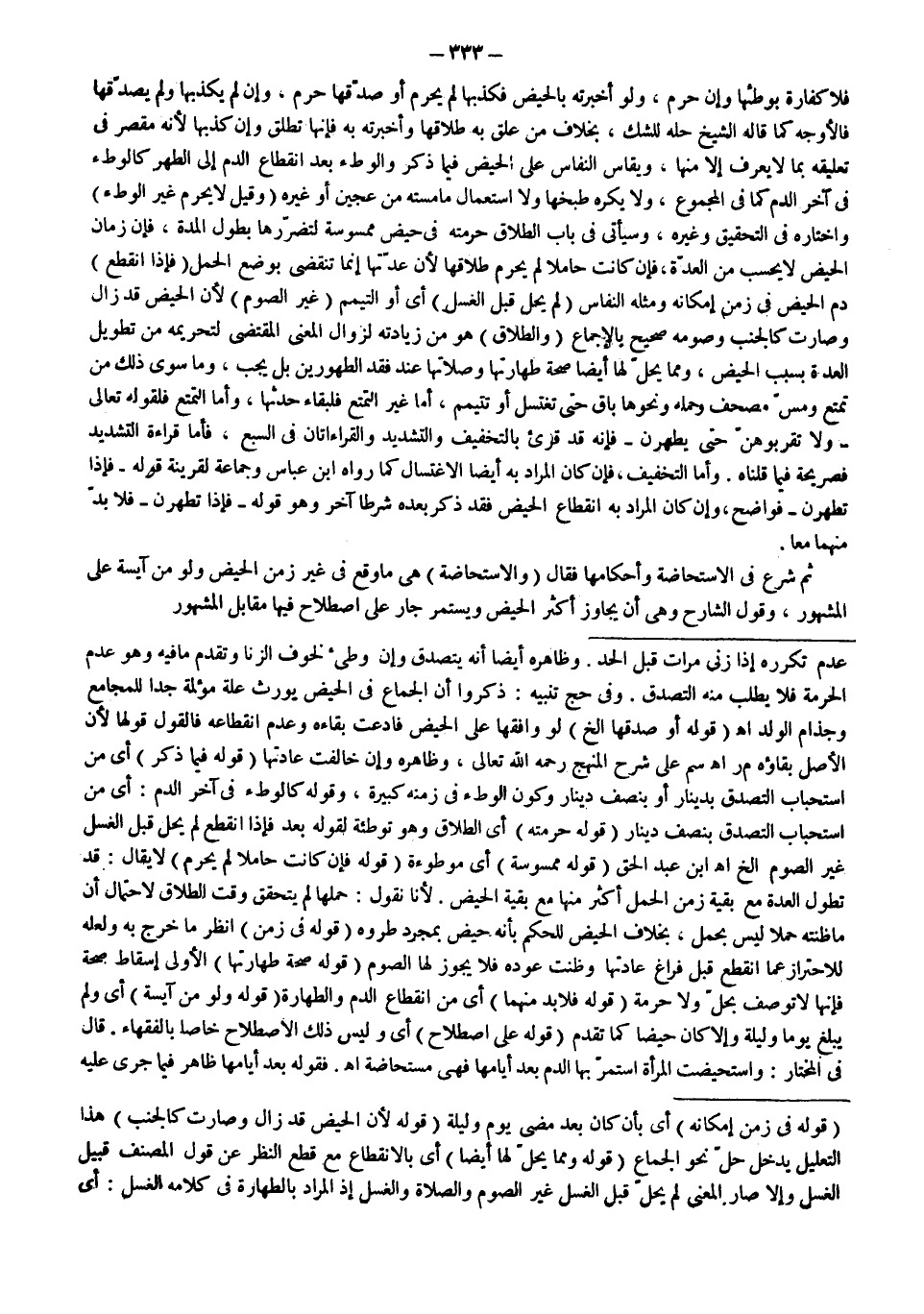 وَفِي حَجّ تَنْبِيهٌ ذَكَرُوا أَنَّ الْجِمَاعَ فِي الْحَيْضِ يُورِثُ عِلَّةً مُؤْلِمَةً جِدًّا لِلْمُجَامِعِ وَجُذَامَ الْوَلَدِ اهـ (قَوْلُهُ: أَوْ صَدَّقَهَا إلَخْ) لَوْ وَافَقَهَا عَلَى الْحَيْضِ فَادَّعَتْ بَقَاءَهُ وَعَدَمَ انْقِطَاعِهِ فَالْقَوْلُ قَوْلُهَا لِأَنَّ الْأَصْلَ بَقَاؤُهُ م ر اهـ سم عَلَى شَرْحِ الْمَنْهَجِ - رَحِمَهُ اللَّهُ تَعَالَى -، وَظَاهِرُهُ وَإِنْ خَالَفَتْ عَادَتَهَا (قَوْلُهُ: فِيمَا ذُكِرَ) أَيْ مِنْ اسْتِحْبَابِ التَّصَدُّقِ بِدِينَارٍ أَوْ بِنِصْفِ دِينَارٍ وَكَوْنِ الْوَطْءِ فِي زَمَنِهِ كَبِيرَةً، وَقَوْلُهُ: كَالْوَطْءِ فِي آخِرِ الدَّمِ: أَيْ مِنْ اسْتِحْبَابِ التَّصَدُّقِ بِنِصْفِ دِينَارٍ (قَوْلُهُ حُرْمَتُهُ) أَيْ الطَّلَاقِ وَهُوَ تَوْطِئَةٌ لِقَوْلِهِ بَعْدُ فَإِذَا انْقَطَعَ لَمْ يَحِلَّ قَبْلَ الْغُسْلِ غَيْرُ الصَّوْمِ إلَخْ اهـ ابْنُ عَبْدِ الْحَقِّ (قَوْلُهُ: مَمْسُوسَةٍ) أَيْ مَوْطُوءَةٍ (قَوْلُهُ: فَإِنْ كَانَتْ حَامِلًا لَمْ يَحْرُمْ) لَا يُقَالُ: قَدْ تَطُولُ الْعِدَّةُ مَعَ بَقِيَّةِ زَمَنِ الْحَمْلِ أَكْثَرَ مِنْهَا مَعَ بَقِيَّةِ الْحَيْضِ.