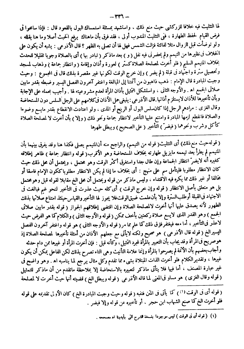 ـــــــــــــــــــــــــــــSقَوْلُهُ: حَيْثُ مَنَعَ ذَلِكَ) أَيْ التَّثْلِيثَ (قَوْلُهُ: مِنْ التَّيَمُّمِ) وَالرَّاجِحُ مِنْهُ أَنَّ الْمُتَيَمِّمَ يُصَلِّي فَكَذَا هُنَا وَقَدْ يُفَرَّقُ بَيْنَهُمَا بِأَنَّ الْمُتَيَمِّمَ لَمْ يَطْرَأْ بَعْدَ تَيَمُّمِهِ مَا يُزِيلُ طَهَارَتَهُ بِخِلَافِ الْمُسْتَحَاضَةِ وَهُوَ الْأَقْرَبُ (قَوْلُهُ: وَانْتِظَارِ جَمَاعَةٍ) ظَاهِرُ إطْلَاقِهِ كَغَيْرِهِ أَنَّهُ لَا يَضُرُّ انْتِظَارُ الْجَمَاعَةِ وَإِنْ طَالَ جِدًّا وَاسْتَغْرَقَ أَكْثَرَ الْوَقْتِ وَهُوَ مُحْتَمَلٌ، وَيَحْتَمِلُ أَنَّ مَحَلَّ ذَلِكَ حَيْثُ كَانَ الِانْتِظَارُ مَطْلُوبًا فَلْيُتَأَمَّلْ سم عَلَى مَنْهَجٍ: أَيْ بِخِلَافِ مَا إذَا لَمْ يَكُنْ الِانْتِظَارُ مَطْلُوبًا كَكَوْنِ الْإِمَامِ فَاسِقًا أَوْ مُخَالِفًا أَوْ غَيْرَ ذَلِكَ مِمَّا يُكْرَهُ فِيهِ الِاقْتِدَاءُ، وَلَيْسَ مَا ذَكَرَ مِنْ قَوْلِهِ وَيَحْتَمِلُ أَنَّ مَحَلَّ إلَخْ مُقَابِلًا لِقَوْلِهِ قَبْلُ وَهُوَ مُحْتَمَلٌ بَلْ هُوَ مُتَعَلِّقٌ بِأَصْلِ الِانْتِظَارِ (قَوْلُهُ: وَإِنْ خَرَجَ الْوَقْتُ) أَيْ كُلُّهُ حَيْثُ عُذِرَتْ فِي التَّأْخِيرِ لِنَحْوِ غَيْمٍ فَبَالَغَتْ فِي الِاجْتِهَادِ فِي الْقِبْلَةِ أَوْ طَلَبِ السُّتْرَةِ وَإِلَّا بِأَنْ عَلِمَتْ ضِيقَ الْوَقْتِ فَلَا يَجُوزُ لَهَا التَّأْخِيرُ، وَالْقِيَاسُ حِينَئِذٍ امْتِنَاعُ صَلَاتِهَا بِذَلِكَ الطَّهُورِ لِأَنَّهُ يَصْدُقُ عَلَيْهَا أَنَّهَا أَخَّرَتْ لَا لِمَصْلَحَةِ الصَّلَاةِ وَإِنْ اقْتَضَى إطْلَاقُهُمْ الْجَوَازَ (قَوْلُهُ: بِقَدْرِ مَا بَيْنَ صَلَاتَيْ الْجَمْعِ) وَهُوَ الْقَدْرُ الَّذِي لَا يَسَعُ صَلَاةَ رَكْعَتَيْنِ بِأَخَفِّ مُمْكِنٍ (قَوْلُهُ: وَالْأَوْجَهُ الثَّانِي) وَالْكَلَامُ كَمَا هُوَ الْفَرْضُ حَيْثُ لَا عُذْرَ فِي التَّأْخِيرِ، أَمَّا مَعَهُ فَيُغْتَفَرُ فَوْقَ ذَلِكَ كَمَا عُلِمَ مِمَّا مَرَّ (قَوْلُهُ: وَالْأَوْجَهُ الثَّانِي) هُوَ قَوْلُهُ: وَاغْتَفَرَ آخَرُونَ الْفَصْلَ الْيَسِيرَ إلَخْ (قَوْلُهُ: قَالَ الْأَذْرَعِيُّ) هُوَ صَحِيحٌ وَلَكِنَّهُ لَا يَأْتِي مَعَ جَعْلِهِمْ الْأَذَانَ مِنْ أَمْثِلَةِ تَأْخِيرِهَا لِمَصْلَحَةِ الصَّلَاةِ إذْ هُوَ صَرِيحٌ فِي الْمَرْأَةِ وَقَدْ يُجَابُ بِأَنَّ التَّعْبِيرَ بِالْمَرْأَةِ لِمُجَرَّدِ التَّمْثِيلِ، وَكَأَنَّهُ قِيلَ: فَإِنْ أَخَّرَتْ الْمَرْأَةُ أَوْ غَيْرُهَا مِمَّنْ دَامَ حَدَثُهُ. وَأَجَابَ بَعْضُهُمْ بِأَنَّ الْأَئِمَّةَ لَمْ يُصَرِّحُوا بِالْمَرْأَةِ وَإِنَّمَا عَلَامَةُ التَّأْنِيثِ وَهِيَ التَّاءُ تُصَرِّحُ بِذَلِكَ لَكِنَّ الْفَاعِلَ يُمْكِنُ أَنْ يَكُونَ غَيْرَهَا، وَتَقْدِيرُ الْكَلَامِ فَلَوْ أَخَّرَتْ الذَّاتُ الْمُبْتَلَاةُ بِشَيْءٍ مِمَّا تَقَدَّمَ وَكُلُّ مِثَالٍ يَرْجِعُ لِمَا يُنَاسِبُهُ اهـ.