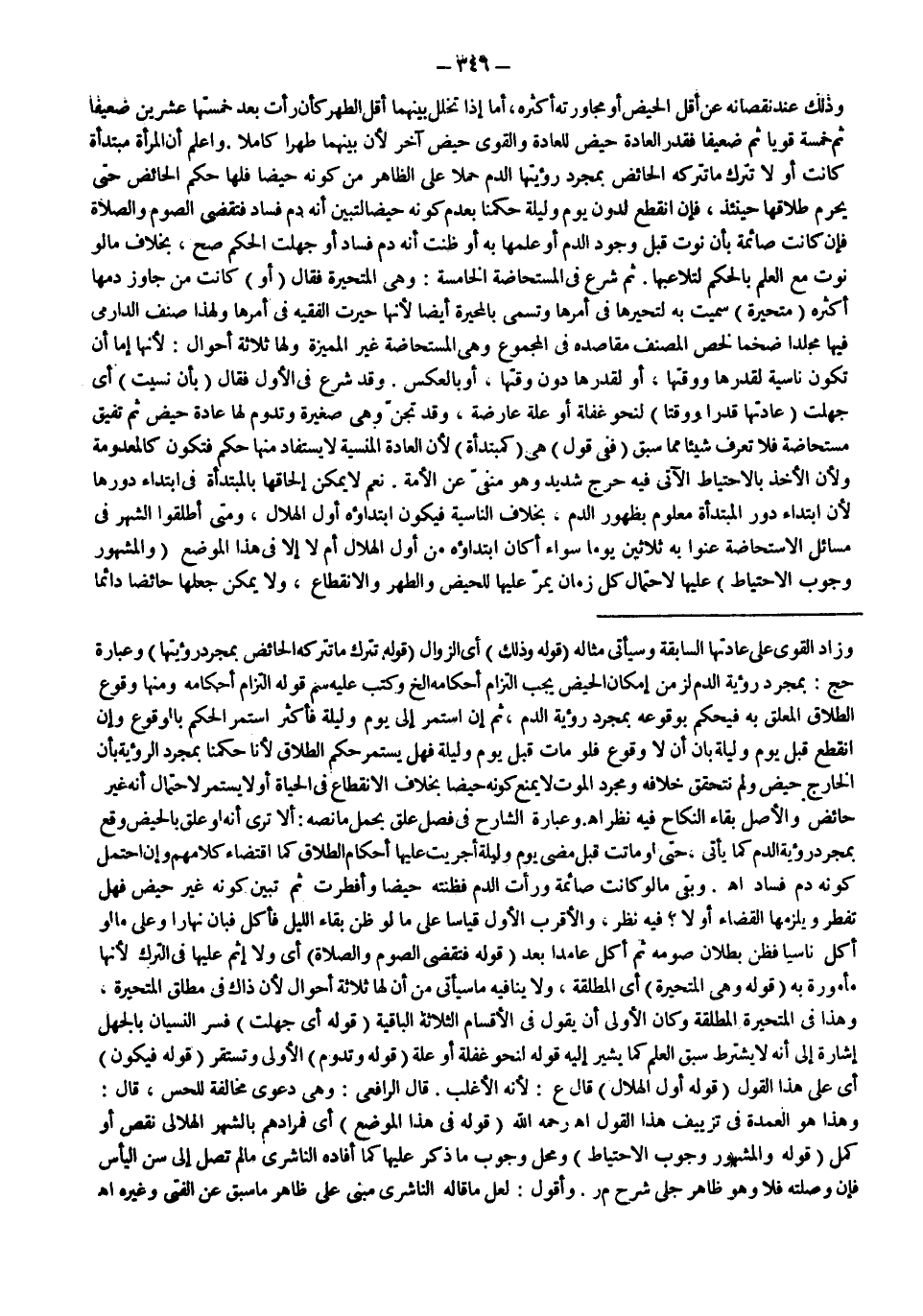 قَالَ الرَّافِعِيُّ: وَهِيَ دَعْوَى مُخَالِفَةٌ لِلْحِسِّ، قَالَ: وَهَذَا هُوَ الْعُمْدَةُ فِي تَزْيِيفِ هَذَا الْقَوْلِ اهـ - رَحِمَهُ اللَّهُ - (قَوْلُهُ: فِي هَذَا الْمَوْضِعِ) أَيْ فَمُرَادُهُمْ بِالشَّهْرِ الْهِلَالِيِّ نَقَصَ أَوْ كَمَلَ (قَوْلُهُ: وَالْمَشْهُورُ وُجُوبُ الِاحْتِيَاطِ) وَمَحَلُّ وُجُوبِ مَا ذُكِرَ عَلَيْهَا كَمَا أَفَادَهُ النَّاشِرِيُّ مَا لَمْ تَصِلْ إلَى سِنِّ الْيَأْسِ فَإِنْ وَصَلَتْهُ فَلَا وَهُوَ ظَاهِرُ جَلِيِّ شَرْحِ م ر.