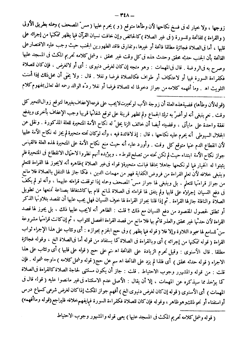 قُلْت: جَازَ أَنْ يَكُونَ مُسْتَثْنًى لِحَاجَةِ الصَّلَاةِ كَالْقِرَاءَةِ فِي الصَّلَاةِ كَمَا يُؤْخَذُ مِمَّا سَيَذْكُرُهُ عَنْ الْمُهِمَّاتِ، إلَّا أَنْ يُقَالَ: الْأَصْلُ عَدَمُ الِاسْتِثْنَاءِ فِي غَيْرِ مَا نَصُّوا عَلَيْهِ (قَوْلُهُ: قَالَ فِي الْمُهِمَّاتِ) أَيْ الْإِسْنَوِيُّ (قَوْلُهُ: إنْ كَانَ لِغَرَضٍ دُنْيَوِيٍّ إلَخْ) أَفْهَمَ جَوَازُ الْمُكْثِ إذَا كَانَ لِغَرَضٍ شَرْعِيٍّ كَسَمَاعِ دَرْسٍ أَوْ اسْتِفْتَاءٍ أَوْ نَحْوِ ذَلِكَ وَهُوَ ظَاهِرٌ، وَقَوْلُهُ: فَإِنْ كَانَ لِلصَّلَاةِ فَكَقِرَاءَةِ السُّورَةِ فِيمَا يُفْهَمُ خِلَافُهُ فَلْيُرَاجَعْ (قَوْلُهُ: وَمَا أَفْهَمَهُ)