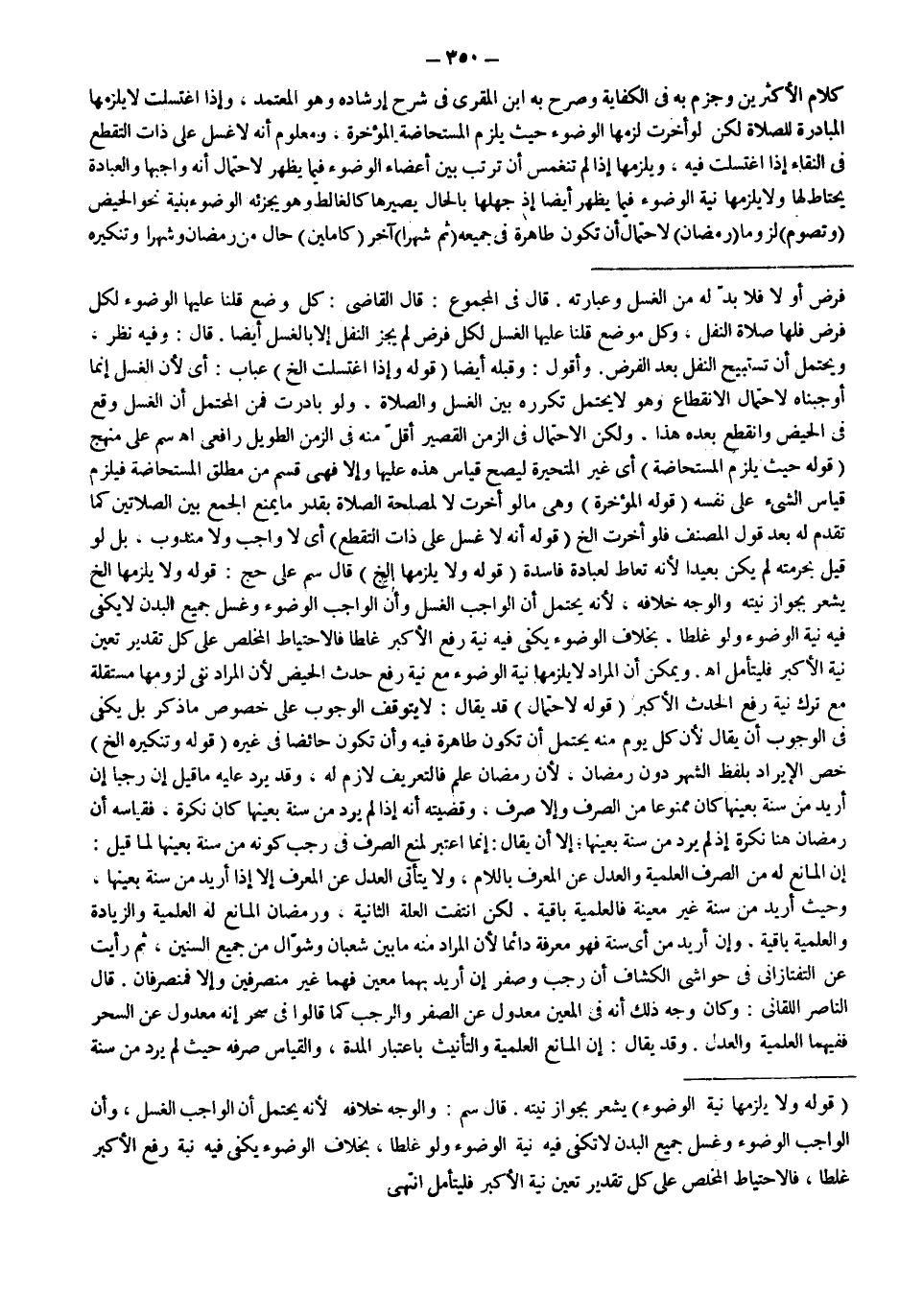 وَيُمْكِنُ أَنَّ الْمُرَادَ لَا يَلْزَمُهَا نِيَّةُ الْوُضُوءِ مَعَ نِيَّةِ رَفْعِ حَدَثِ الْحَيْضِ لِأَنَّ الْمُرَادَ نَفْيُ لُزُومِهَا مُسْتَقِلَّةً مَعَ تَرْكِ نِيَّةِ رَفْعِ الْحَدَثِ الْأَكْبَرِ (قَوْلُهُ: لِاحْتِمَالِ) قَدْ يُقَالُ: لَا يَتَوَقَّفُ الْوُجُوبُ عَلَى خُصُوصِ مَا ذُكِرَ بَلْ يَكْفِي فِي الْوُجُوبِ أَنْ يُقَالَ لِأَنَّ كُلَّ يَوْمٍ مِنْهُ يَحْتَمِلُ أَنْ تَكُونَ طَاهِرَةً فِيهِ وَأَنْ تَكُونَ حَائِضًا فِي غَيْرِهِ (قَوْلُهُ: وَتَنْكِيرُهُ إلَخْ) خَصَّ الْإِيرَادَ بِلَفْظِ الشَّهْرِ دُونَ رَمَضَانَ، لِأَنَّ رَمَضَانَ عُلِمَ فَالتَّعْرِيفُ لَازِمٌ لَهُ، وَقَدْ يَرُدُّ عَلَيْهِ مَا قِيلَ إنَّ رَجَبًا إنْ أُرِيدَ مِنْ سَنَةٍ بِعَيْنِهَا كَانَ مَمْنُوعًا مِنْ الصَّرْفِ وَإِلَّا صُرِفَ، وَقَضِيَّتُهُ أَنَّهُ إذَا لَمْ يُرَدْ مِنْ سَنَةٍ بِعَيْنِهَا كَانَ نَكِرَةً، فَقِيَاسُهُ أَنَّ رَمَضَانَ هُنَا نَكِرَةٌ إذْ لَمْ يُرَدْ مِنْ سَنَةٍ بِعَيْنِهَا؛ إلَّا أَنْ يُقَالَ: إنَّمَا اُعْتُبِرَ لِمَنْعِ الصَّرْفِ فِي رَجَبٍ كَوْنُهُ مِنْ سَنَةٍ بِعَيْنِهَا لِمَا قِيلَ: إنَّ الْمَانِعَ لَهُ مِنْ الصَّرْفِ الْعَلَمِيَّةُ وَالْعَدْلُ عَنْ الْمُعَرَّفِ بِاللَّامِ، وَلَا يَتَأَتَّى الْعَدْلُ عَنْ الْمُعَرَّفِ إلَّا إذَا أُرِيدَ مِنْ سَنَةٍ بِعَيْنِهَا، وَحَيْثُ أُرِيدَ مِنْ سَنَةٍ غَيْرِ مُعَيَّنَةٍ فَالْعَلَمِيَّةُ بَاقِيَةٌ، لَكِنْ انْتَفَتْ الْعِلَّةُ الثَّانِيَةُ، وَرَمَضَانُ الْمَانِعُ لَهُ الْعَلَمِيَّةُ وَالزِّيَادَةُ وَالْعَلَمِيَّةُ بَاقِيَةٌ، وَإِنْ أُرِيدَ مِنْ أَيِّ سَنَةٍ فَهُوَ مَعْرِفَةٌ دَائِمًا لِأَنَّ الْمُرَادَ مِنْهُ مَا بَيْنَ شَعْبَانَ وَشَوَّالٍ مِنْ جَمِيعِ السِّنِينَ، ثُمَّ رَأَيْت عَنْ التَّفْتَازَانِيِّ فِي حَوَاشِي الْكَشَّافِ أَنَّ رَجَبَ وَصَفَرَ إنْ أُرِيدَ بِهِمَا مُعَيَّنٌ فَهُمَا غَيْرُ مُنْصَرِفَيْنِ وَإِلَّا فَمُنْصَرِفَانِ.