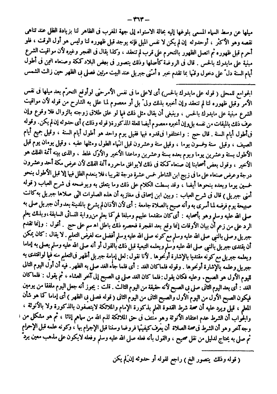 ـــــــــــــــــــــــــــــSالْجَوَامِعِ لِلْمَحَلِّيِّ (قَوْلُهُ: عَلَى مَا يُدْرَكُ بِالْحِسِّ) أَيْ لَا عَلَى مَا فِي نَفْسِ الْأَمْرِ حَتَّى لَوْ أَوْقَعَ التَّحَرُّمَ بَعْدَ مَيْلِهَا فِي نَفْسِ الْأَمْرِ وَقَبْلَ ظُهُورِهِ لَنَا لَمْ تَنْعَقِدْ وَإِنْ أَخْبَرَهُ بِذَلِكَ وَلِيٌّ بَلْ أَوْ مَعْصُومٌ لِمَا عَلَّلَ بِهِ الشَّارِحُ مِنْ قَوْلِهِ لِأَنَّ مَوَاقِيتَ الشَّرْعِ مَبْنِيَّةٌ عَلَى مَا يُدْرَكُ بِالْحِسِّ، وَيَنْبَغِي أَنْ يُقَالَ مِثْلُ ذَلِكَ فِيمَا لَوْ عَلَّقَ طَلَاقَ زَوْجَتِهِ بِالزَّوَالِ فَلَا وُقُوعَ وَإِنْ عَرَفَ ذَلِكَ بِالْمِيقَاتِ مِنْ نَفْسِهِ بَلْ وَإِنْ أَخْبَرَهُ مَعْصُومٌ أَيْضًا لِلْعِلَّةِ الْمَذْكُورَةِ (قَوْلُهُ: وَذَلِكَ) أَيْ حُدُوثُهُ إنْ لَمْ يَكُنْ.