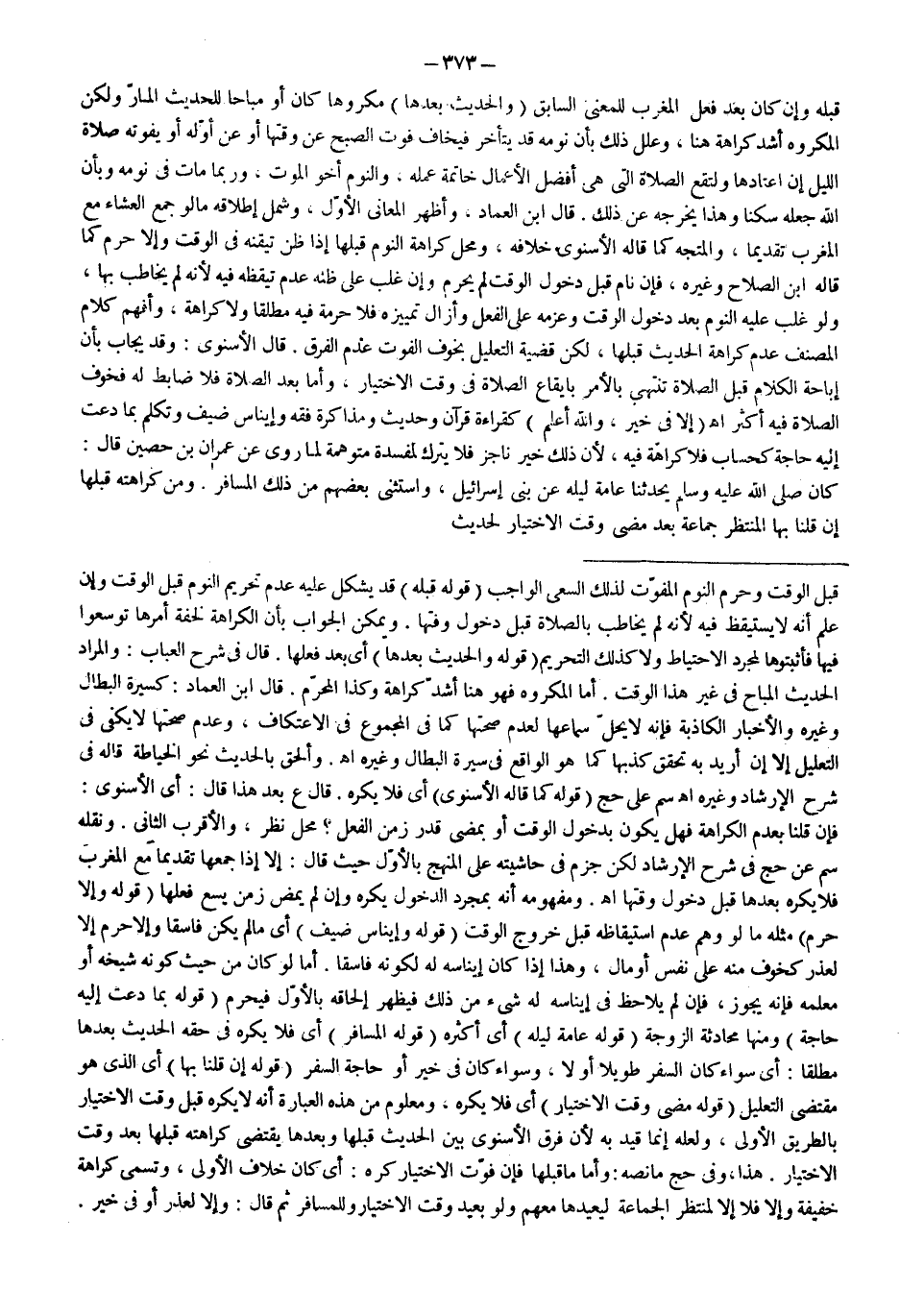 قَبْلَهُ وَإِنْ كَانَ بَعْدَ فِعْلِ الْمَغْرِبِ لِلْمَعْنَى السَّابِقِ (وَالْحَدِيثُ بَعْدَهَا) مَكْرُوهًا كَانَ أَوْ مُبَاحًا لِلْحَدِيثِ الْمَارِّ وَلَكِنَّ الْمَكْرُوهَ أَشَدُّ كَرَاهَةً هُنَا، وَعَلَّلَ ذَلِكَ بِأَنَّ نَوْمَهُ قَدْ يَتَأَخَّرُ فَيَخَافُ فَوْتَ الصُّبْحِ عَنْ وَقْتِهَا أَوْ عَنْ أَوَّلِهِ أَوْ يَفُوتُهُ صَلَاةُ اللَّيْلِ إنْ اعْتَادَهَا وَلِتَقَعَ الصَّلَاةُ الَّتِي هِيَ أَفْضَلُ الْأَعْمَالِ خَاتِمَةَ عَمَلِهِ، وَالنَّوْمُ أَخُو الْمَوْتِ، وَرُبَّمَا مَاتَ فِي نَوْمِهِ وَبِأَنَّ اللَّهَ جَعَلَهُ سَكَنًا وَهَذَا يُخْرِجُهُ عَنْ ذَلِكَ.