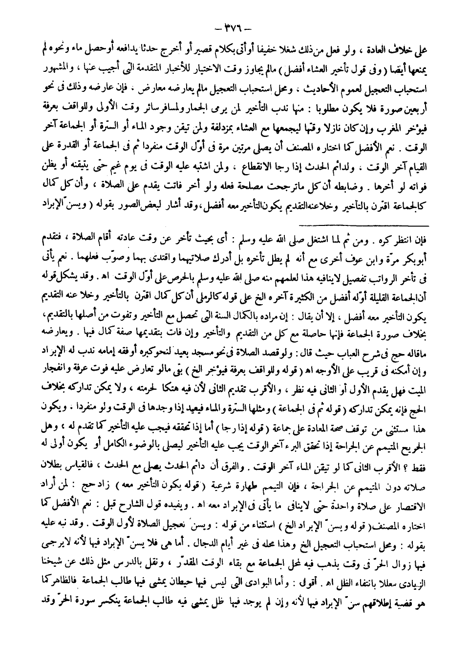 عَلَى خِلَافِ الْعَادَةِ، وَلَوْ فَعَلَ مِنْ ذَلِكَ شُغْلًا خَفِيفًا أَوْ أَتَى بِكَلَامٍ قَصِيرٍ أَوْ أَخْرَجَ حَدَثًا يُدَافِعُهُ أَوْ حَصَلَ مَاءٌ وَنَحْوُهُ لَمْ يَمْنَعْهَا أَيْضًا (وَفِي قَوْلٍ تَأْخِيرُ الْعِشَاءِ أَفْضَلُ) مَا لَمْ يُجَاوِزْ وَقْتَ الِاخْتِيَارِ لِلْأَخْبَارِ الْمُتَقَدِّمَةِ الَّتِي أُجِيبَ عَنْهَا، وَالْمَشْهُورُ اسْتِحْبَابُ التَّعْجِيلِ لِعُمُومِ الْأَحَادِيثِ، وَمَحَلُّ اسْتِحْبَابِ التَّعْجِيلِ مَا لَمْ يُعَارِضْهُ مُعَارِضٌ، فَإِنْ عَارَضَهُ وَذَلِكَ فِي نَحْوِ أَرْبَعِينَ صُورَةً فَلَا يَكُونُ مَطْلُوبًا: مِنْهَا نَدْبُ التَّأْخِيرِ لِمَنْ يَرْمِي الْجِمَارَ وَلِمُسَافِرٍ سَائِرٍ وَقْتَ الْأُولَى وَلِلْوَاقِفِ بِعَرَفَةَ فَيُؤَخِّرُ الْمَغْرِبَ وَإِنْ كَانَ نَازِلًا وَقْتَهَا لِيَجْمَعَهَا مَعَ الْعِشَاءِ بِمُزْدَلِفَةَ وَلِمَنْ تَيَقَّنَ وُجُودَ الْمَاءِ أَوْ السُّتْرَةِ أَوْ الْجَمَاعَةِ آخِرَ الْوَقْتِ.