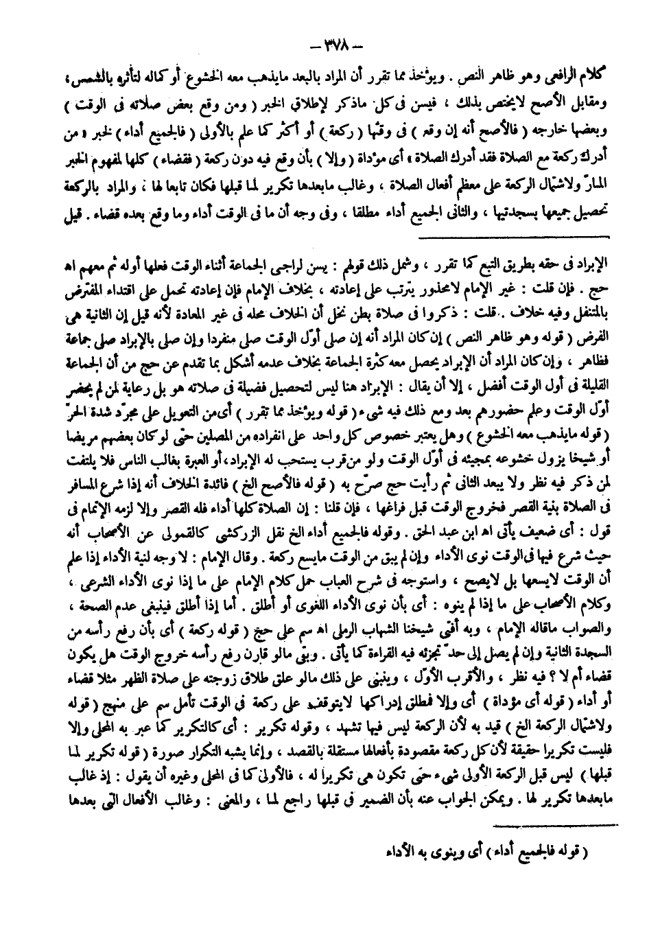 وَقَالَ الْإِمَامُ: لَا وَجْهَ لِنِيَّةِ الْأَدَاءِ إذَا عَلِمَ أَنَّ الْوَقْتَ لَا يَسَعُهَا بَلْ لَا يَصِحُّ، وَاسْتُوْجِهَ فِي شَرْحِ الْعُبَابِ حَمْلُ كَلَامِ الْإِمَامِ عَلَى مَا إذَا نَوَى الْأَدَاءَ الشَّرْعِيَّ، وَكَلَامِ الْأَصْحَابِ عَلَى مَا إذَا لَمْ يَنْوِهِ: أَيْ بِأَنْ نَوَى الْأَدَاءَ اللُّغَوِيَّ أَوْ أَطْلَقَ.