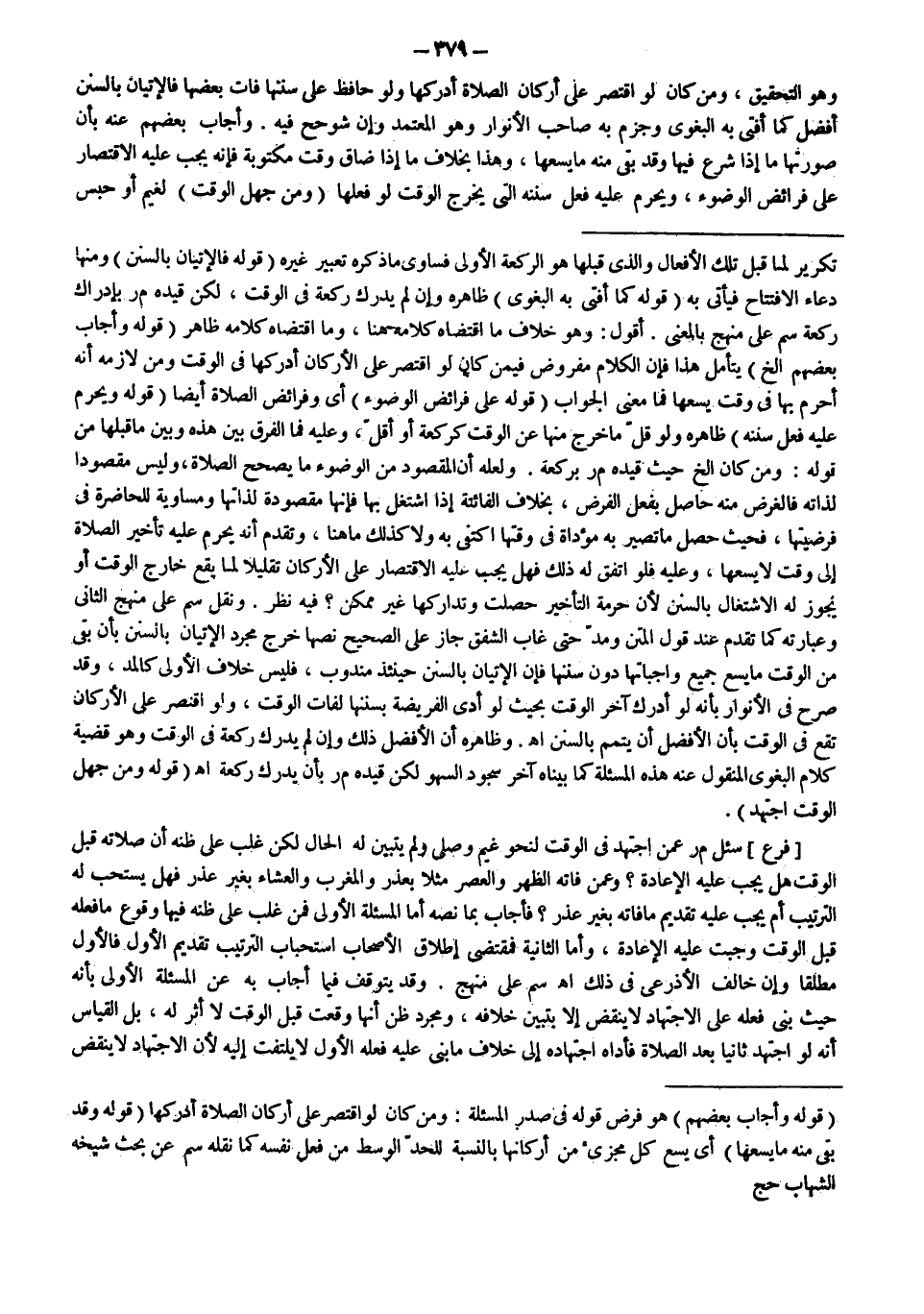 ـــــــــــــــــــــــــــــSتَكْرِيرٌ لِمَا قَبْلَ تِلْكَ الْأَفْعَالِ وَاَلَّذِي قَبْلَهَا هُوَ الرَّكْعَةُ الْأُولَى فَسَاوَى مَا ذَكَرَهُ تَعْبِيرَ غَيْرِهِ (قَوْلُهُ: فَالْإِتْيَانُ بِالسُّنَنِ) وَمِنْهَا دُعَاءُ الِافْتِتَاحِ فَيَأْتِي بِهِ (قَوْلُهُ: كَمَا أَفْتَى بِهِ الْبَغَوِيّ) ظَاهِرُهُ وَإِنْ لَمْ يُدْرِكْ رَكْعَةً فِي الْوَقْتِ، لَكِنْ قَيَّدَهُ م ر بِإِدْرَاكِ رَكْعَةٍ سم عَلَى مَنْهَجٍ بِالْمَعْنَى. أَقُولُ: وَهُوَ خِلَافُ مَا اقْتَضَاهُ كَلَامُهُ هُنَا، وَمَا اقْتَضَاهُ كَلَامُهُ ظَاهِرٌ (قَوْلُهُ: وَأَجَابَ بَعْضُهُمْ إلَخْ) يُتَأَمَّلُ هَذَا فَإِنَّ الْكَلَامَ مَفْرُوضٌ فِيمَنْ كَانَ لَوْ اقْتَصَرَ عَلَى الْأَرْكَانِ أَدْرَكَهَا فِي الْوَقْتِ وَمَنْ لَازَمَهُ أَنَّهُ أَحْرَمَ بِهَا فِي وَقْتٍ يَسَعُهَا فَمَا مَعْنَى الْجَوَابِ (قَوْلُهُ: عَلَى فَرَائِضِ الْوُضُوءِ) أَيْ وَفَرَائِضِ الصَّلَاةِ أَيْضًا (قَوْلُهُ: وَيَحْرُمُ عَلَيْهِ فِعْلُ سُنَنِهِ) ظَاهِرُهُ وَلَوْ قَلَّ مَا خَرَجَ مِنْهَا عَنْ الْوَقْتِ كَرَكْعَةٍ أَوْ أَقَلَّ، وَعَلَيْهِ فَمَا الْفَرْقُ بَيْنَ هَذِهِ وَبَيْنَ مَا قَبْلَهَا مِنْ قَوْلِهِ: وَمَنْ كَانَ إلَخْ حَيْثُ قَيَّدَهُ م ر بِرَكْعَةٍ.