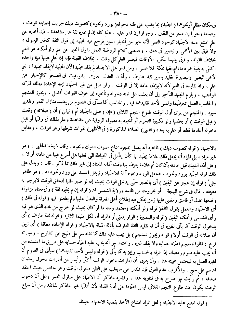 وَفُرِّقَ بَيْنَهُمَا بِتَكَرُّرِ الْأَوْقَاتِ فَيَعْسُرُ الْعِلْمُ كُلَّ وَقْتٍ. بِخِلَافِ الْقِبْلَةِ فَإِنَّهُ إذَا عَلِمَ عَيْنَهَا مَرَّةً وَاحِدَةً اكْتَفَى بِهِ بَقِيَّةَ عُمْرِهِ مَا دَامَ مُقِيمًا بِمَكَّةَ فَلَا عُسْرَ، وَمَنْ قَدَرَ عَلَى الِاجْتِهَادِ لَمْ يُقَلِّدْ مُجْتَهِدًا لِأَنَّ الْمُجْتَهِدَ لَا يُقَلِّدُ مُجْتَهِدًا، نَعَمْ لِأَعْمَى الْبَصَرِ وَالْبَصِيرَةِ تَقْلِيدُ بَصِيرٍ ثِقَةٍ عَارِفٍ، وَأَذَانُ الْعَدْلِ الْعَارِفِ بِالْمَوَاقِيتِ فِي الصَّحْوِ كَالْإِخْبَارِ عَنْ عِلْمٍ، وَلَهُ تَقْلِيدُهُ فِي الْغَيْمِ لِأَنَّهُ لَا يُؤَذِّنُ عَادَةً إلَّا فِي الْوَقْتِ، وَلَوْ صَلَّى مِنْ غَيْرِ اجْتِهَادٍ لَزِمَهُ الْإِعَادَةُ مُطْلَقًا لِتَرْكِهِ الْوَاجِبَ، وَيَلْزَمُ الْمُجْتَهِدَ التَّأْخِيرُ إلَى أَنْ يَغْلِبَ عَلَى ظَنِّهِ دُخُولُهُ وَتَأْخِيرُهُ إلَى خَوْفِ الْفَوَاتِ أَفْضَلُ، وَيَجُوزُ لِلْمُنَجِّمِ وَالْحَاسِبِ الْعَمَلُ بِمَعْرِفَتِهِمَا وَلَيْسَ لِأَحَدٍ تَقْلِيدُهُمَا فِيهِ.