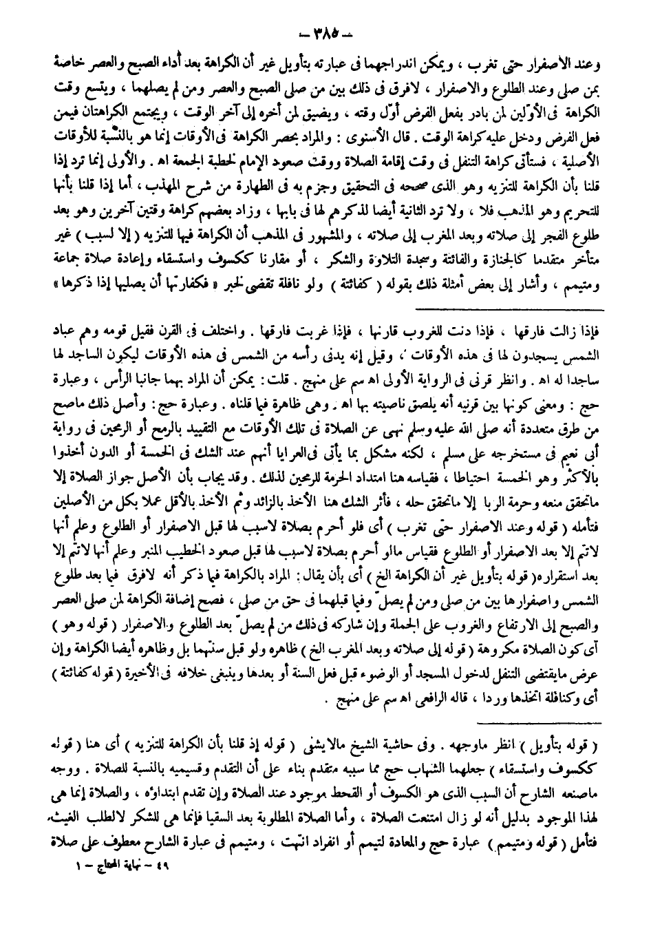 وَعِبَارَةُ حَجّ: وَأَصْلُ ذَلِكَ مَا صَحَّ مِنْ طُرُقٍ مُتَعَدِّدَةٍ أَنَّهُ - صَلَّى اللَّهُ عَلَيْهِ وَسَلَّمَ - نَهَى عَنْ الصَّلَاةِ فِي تِلْكَ الْأَوْقَاتِ مَعَ التَّقْيِيدِ بِالرُّمْحِ أَوْ الرُّمْحَيْنِ فِي رِوَايَةِ أَبِي نُعَيْمٍ فِي مُسْتَخْرَجِهِ عَلَى مُسْلِمٍ، لَكِنَّهُ مُشْكِلٌ بِمَا يَأْتِي فِي الْعَرَايَا أَنَّهُمْ عِنْدَ الشَّكِّ فِي الْخَمْسَةِ أَوْ الدُّونِ أَخَذُوا بِالْأَكْثَرِ وَهُوَ الْخَمْسَةُ احْتِيَاطًا، فَقِيَاسُهُ هُنَا امْتِدَادُ الْحُرْمَةِ لِلرُّمْحَيْنِ لِذَلِكَ.