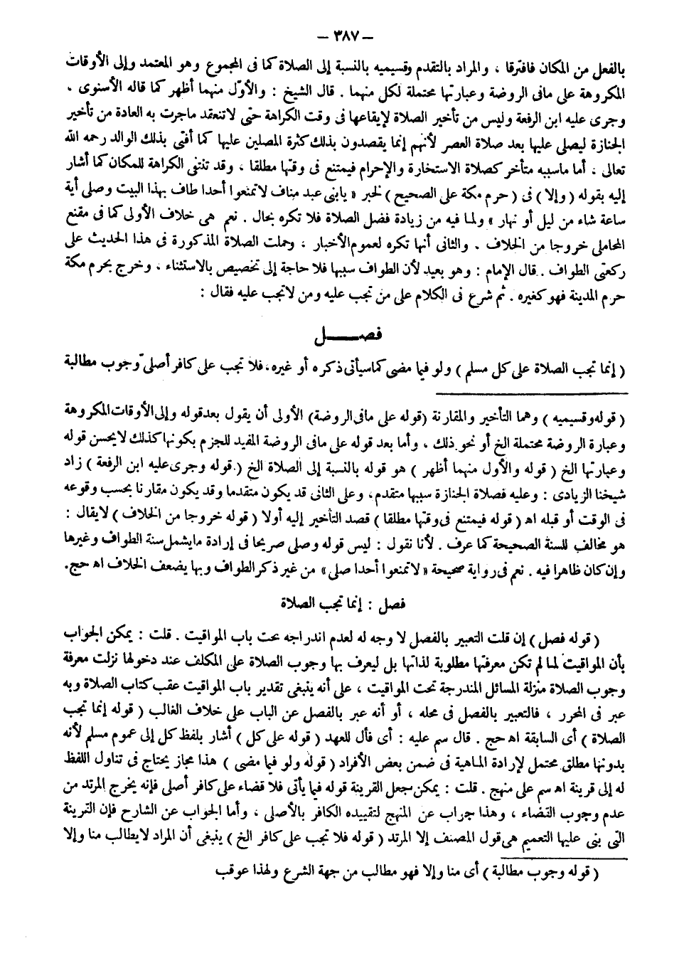 ثُمَّ شَرَعَ فِي الْكَلَامِ عَلَى مَنْ تَجِبُ عَلَيْهِ وَمَنْ لَا تَجِبُ عَلَيْهِ فَقَالَ فَصْلٌ (إنَّمَا تَجِبُ الصَّلَاةُ عَلَى كُلِّ مُسْلِمٍ) وَلَوْ فِيمَا مَضَى كَمَا سَيَأْتِي ذِكْرُهُ أَوْ غَيْرُهُ، فَلَا تَجِبُ عَلَى كَافِرٍ أَصْلِيٍّ وُجُوبَ مُطَالَبَةٍ