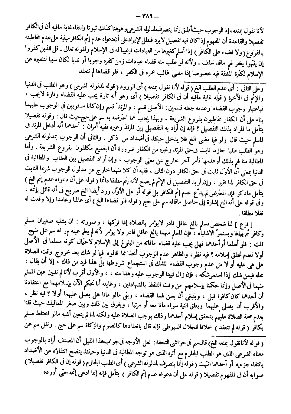 ـــــــــــــــــــــــــــــSوَعَلَى الثَّانِي: أَيْ عَدَمِ الطَّلَبِ إلَخْ (قَوْلُهُ: لِأَنَّا نَقُولُ بِمَنْعِهِ) أَيْ الْوُرُودَ (قَوْلُهُ: لِمَدْلُولِهِ الشَّرْعِيِّ) وَهُوَ الطَّلَبُ فِي الدُّنْيَا وَالْإِثْمُ فِي الْآخِرَةِ (قَوْلُهُ غَايَةُ مَا فِيهِ أَنَّ فِي الْكَافِرِ تَفْصِيلًا) أَيْ وَهُوَ أَنَّهُ تَارَةً يَجِبُ عَلَيْهِ الْقَضَاءُ وَتَارَةً لَا يَجِبُ، فَبِاعْتِبَارِ وُجُوبِ الْقَضَاءِ وَعَدَمِهِ جَعَلَهُ قِسْمَيْنِ: الْأَصْلِيُّ قِسْمٌ، وَالْمُرْتَدُّ قِسْمٌ وَإِنْ كَانَا مُسْتَوِيَيْنِ فِي الْوُجُوبِ عَلَيْهِمَا بِنَاءً عَلَى أَنَّ الْكُفَّارَ مُخَاطَبُونَ بِفُرُوعِ الشَّرِيعَةِ، وَبِهَذَا يُجَابُ عَمَّا اعْتَرَضَهُ بِهِ سم عَلَى حَجّ حَيْثُ قَالَ: وَقَوْلُهُ تَفْصِيلًا يُتَأَمَّلُ مَا الْمُرَادُ بِذَلِكَ التَّفْصِيلِ؟ فَإِنَّهُ إنْ أَرَادَ بِهِ التَّفْصِيلَ بَيْنَ الْمُرْتَدِّ وَغَيْرِهِ فَفِيهِ أَمْرَانِ: أَحَدُهُمَا أَنَّهُ أَدْخَلَ الْمُرْتَدَّ فِي الْمُسْلِمِ حَيْثُ قَالَ وَلَوْ فِيمَا مَضَى إلَخْ فَلَا يَدْخُلُ حِينَئِذٍ فِي أَضْدَادِ مَنْ ذَكَرَ.