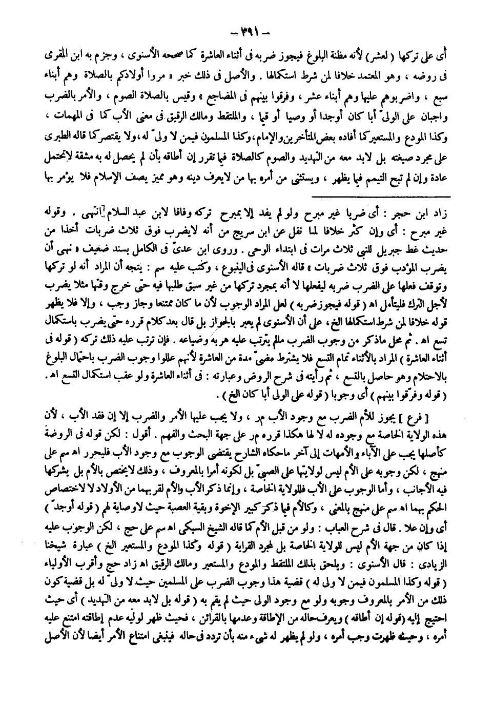 ثُمَّ مَحَلُّ مَا ذَكَرَ مِنْ وُجُوبِ الضَّرْبِ مَا لَمْ يَتَرَتَّبْ عَلَيْهِ هَرَبُهُ وَضَيَاعُهُ. فَإِنْ تَرَتَّبَ عَلَيْهِ ذَلِكَ تَرَكَهُ (قَوْلُهُ: فِي أَثْنَاءِ الْعَاشِرَةِ) الْمُرَادُ بِالْأَثْنَاءِ تَمَامُ التِّسْعِ فَلَا يَشْتَرِطُ مُضِيَّ مُدَّةٍ مِنْ الْعَاشِرَةِ لِأَنَّهُمْ عَلَّلُوا وُجُوبَ الضَّرْبِ بِاحْتِمَالِ الْبُلُوغِ بِالِاحْتِلَامِ وَهُوَ حَاصِلٌ بِالتِّسْعِ، ثُمَّ رَأَيْتُهُ فِي شَرْحِ الرَّوْضِ وَعِبَارَتُهُ: فِي أَثْنَاءِ الْعَاشِرَةِ وَلَوْ عَقِبَ اسْتِكْمَالِ التِّسْعِ اهـ.