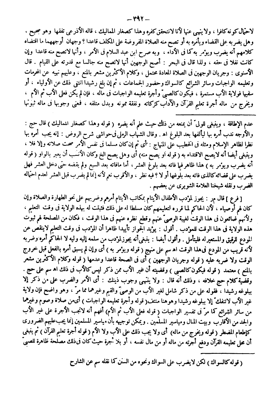 قَالَ الْإِسْنَوِيُّ: وَجَرَيَانُ الْوَجْهَيْنِ فِي الصَّلَاةِ الْمُعَادَةِ مُحْتَمَلٌ، وَكَلَامُ الْأَكْثَرِينَ مُشْعِرٌ بِالْمَنْعِ، وَعَلَيْهِمْ نَهْيُهُ عَنْ الْمُحَرَّمَاتِ وَتَعْلِيمُهُ الْوَاجِبَاتِ وَسَائِرَ الشَّرَائِعِ كَالسِّوَاكِ وَحُضُورِ الْجَمَاعَاتِ، ثُمَّ إنْ بَلَغَ رَشِيدًا انْتَفَى ذَلِكَ عَنْ الْأَوْلِيَاءِ، أَوْ سَفِيهًا فَوِلَايَةُ الْأَبِ مُسْتَمِرَّةٌ، فَيَكُونُ كَالصَّبِيِّ وَأُجْرَةُ تَعْلِيمِهِ الْوَاجِبَاتِ فِي مَالِهِ، فَإِنْ لَمْ يَكُنْ فَعَلَى الْأَبِ ثُمَّ الْأُمِّ، وَيُخْرِجُ مِنْ مَالِهِ أُجْرَةَ تَعْلِيمِ الْقُرْآنِ وَالْآدَابِ كَزَكَاتِهِ وَنَفَقَةِ مُمَوِّنِهِ وَبَدَلِ مُتْلَفِهِ، فَمَعْنَى وُجُوبِهَا فِي مَالِهِ ثُبُوتُهَا