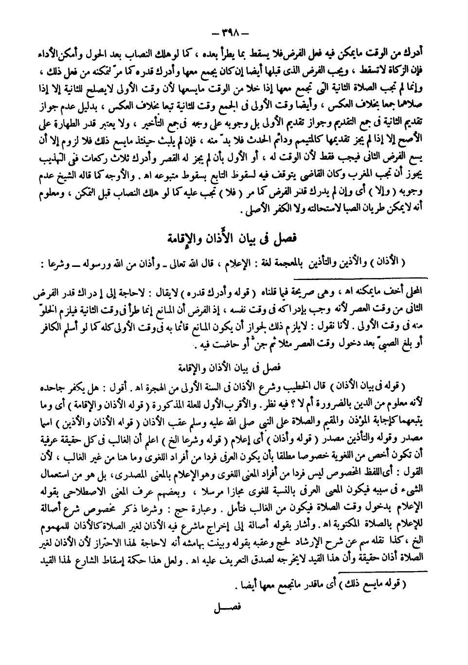 فَصْلٌ فِي بَيَانِ الْأَذَانِ وَالْإِقَامَةِ (قَوْلُهُ: فِي بَيَانِ الْأَذَانِ) قَالَ الْخَطِيبُ وَشُرِعَ الْأَذَانُ فِي السَّنَةِ الْأُولَى مِنْ الْهِجْرَةِ اهـ. أَقُولُ: هَلْ يُكَفَّرُ جَاحِدُهُ لِأَنَّهُ مَعْلُومٌ مِنْ الدِّينِ بِالضَّرُورَةِ أَمْ لَا؟ فِيهِ نَظَرٌ.