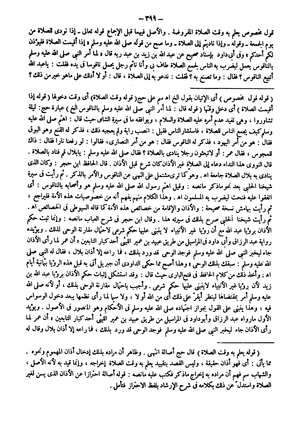 ثُمَّ رَأَيْت فِي سِيرَةِ شَيْخِنَا الْحَلَبِيِّ بَعْدَ نَحْوِ مَا ذَكَرَ مَا نَصُّهُ: وَقِيلَ «اهْتَمَّ رَسُولُ اللَّهِ - صَلَّى اللَّهُ عَلَيْهِ وَسَلَّمَ - هُوَ وَأَصْحَابُهُ بِالنَّاقُوسِ: أَيْ اتَّفَقُوا عَلَيْهِ فَنُحِتَ لِيَضْرِبَ بِهِ الْمُسْلِمُونَ» اهـ.
