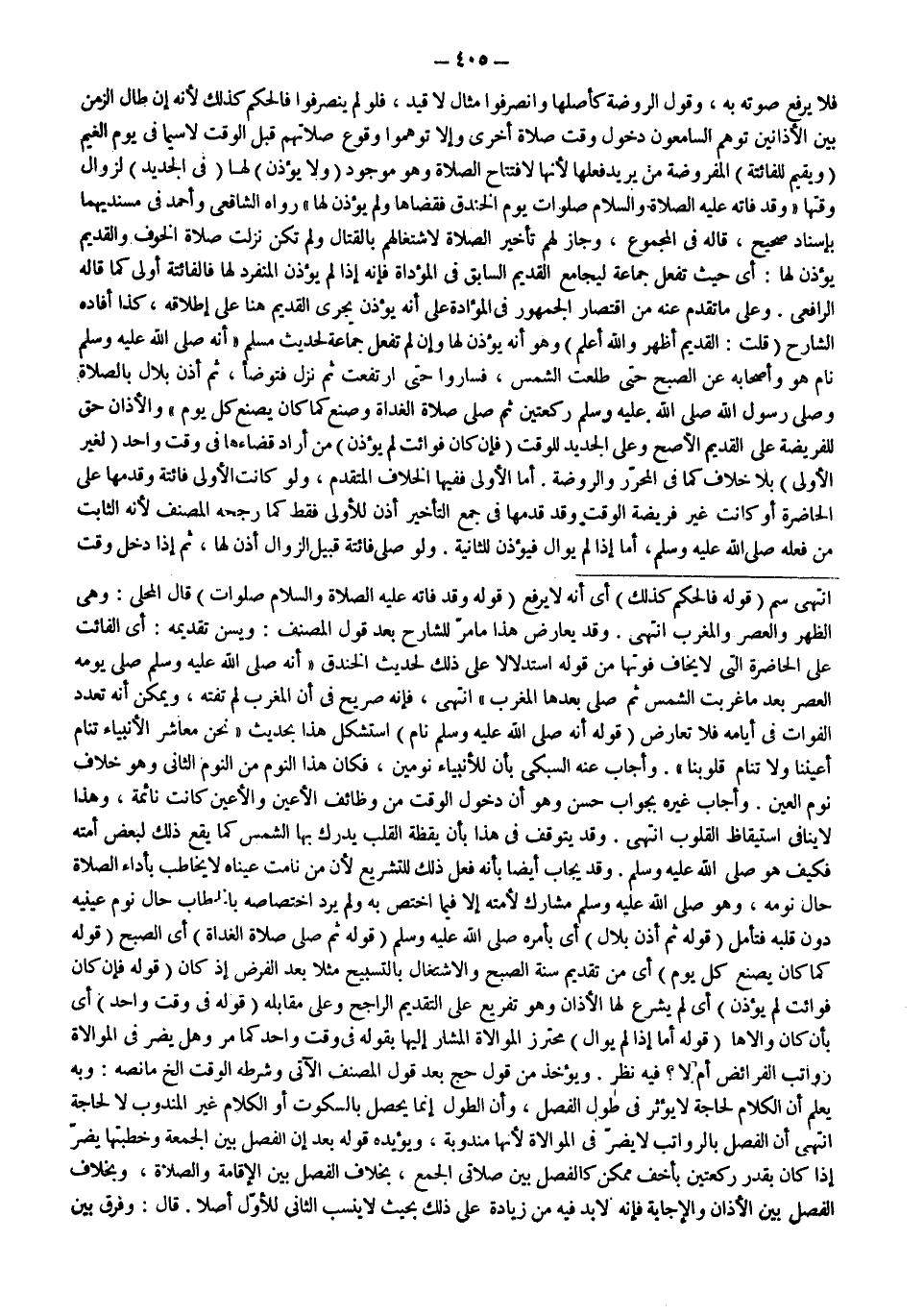 وَأَجَابَ غَيْرُهُ بِجَوَابٍ حَسَنٍ وَهُوَ أَنَّ دُخُولَ الْوَقْتِ مِنْ وَظَائِفِ الْأَعْيُنِ وَالْأَعْيُنُ كَانَتْ نَائِمَةً، وَهَذَا لَا يُنَافِي اسْتِيقَاظَ الْقُلُوبِ انْتَهَى. وَقَدْ يَتَوَقَّفُ فِي هَذَا بِأَنَّ يَقَظَةَ الْقَلْبِ يُدْرِكُ بِهَا الشَّمْسَ كَمَا يَقَعُ ذَلِكَ لِبَعْضِ أُمَّتِهِ فَكَيْفَ هُوَ - صَلَّى اللَّهُ عَلَيْهِ وَسَلَّمَ -. وَقَدْ يُجَابُ أَيْضًا بِأَنَّهُ فَعَلَ ذَلِكَ لِلتَّشْرِيعِ لِأَنَّ مَنْ نَامَتْ عَيْنَاهُ لَا يُخَاطَبُ بِأَدَاءِ الصَّلَاةِ حَالَ نَوْمِهِ، وَهُوَ - صَلَّى اللَّهُ عَلَيْهِ وَسَلَّمَ - مُشَارِكٌ لِأُمَّتِهِ إلَّا فِيمَا اخْتَصَّ بِهِ وَلَمْ يَرِدْ اخْتِصَاصُهُ بِالْخِطَابِ حَالَ نَوْمِ عَيْنَيْهِ دُونَ قَلْبِهِ فَتَأَمَّلْ (قَوْلُهُ: «ثُمَّ أَذَّنَ بِلَالٌ» ) أَيْ بِأَمْرِهِ - صَلَّى اللَّهُ عَلَيْهِ وَسَلَّمَ - (قَوْلُهُ: «ثُمَّ صَلَّى صَلَاةَ الْغَدَاةِ» ) أَيْ الصُّبْحِ (قَوْلُهُ: «كَمَا كَانَ يَصْنَعُ كُلَّ يَوْمٍ» ) أَيْ مِنْ تَقْدِيمِ سُنَّةِ الصُّبْحِ وَالِاشْتِغَالِ بِالتَّسْبِيحِ مَثَلًا بَعْدَ الْفَرْضِ إذْ كَانَ (قَوْلُهُ: فَإِنْ كَانَ فَوَائِتُ لَمْ يُؤَذِّنْ) أَيْ لَمْ يُشَرِّعُ لَهَا الْأَذَانَ وَهُوَ تَفْرِيعٌ عَلَى التَّقْدِيمِ الرَّاجِحِ وَعَلَى مُقَابِلِهِ (قَوْلُهُ: فِي وَقْتٍ وَاحِدٍ) أَيْ بِأَنْ كَانَ وَالَاهَا (قَوْلُهُ: أَمَّا إذَا لَمْ يُوَالِ) مُحْتَرَزُ الْمُوَالَاةِ الْمُشَارِ إلَيْهَا بِقَوْلِهِ فِي وَقْتٍ وَاحِدٍ كَمَا مَرَّ وَهَلْ يَضُرُّ فِي الْمُوَالَاةِ رَوَاتِبُ الْفَرَائِضِ أَمْ لَا؟ فِيهِ نَظَرٌ. وَيُؤْخَذُ مِنْ قَوْلِ حَجّ بَعْدَ قَوْلِ الْمُصَنِّفِ الْآتِي وَشَرْطُهُ الْوَقْتُ إلَخْ مَا نَصُّهُ: وَبِهِ يَعْلَمُ أَنَّ الْكَلَامَ لِحَاجَةٍ لَا يُؤَثِّرُ فِي طُولِ الْفَصْلِ، وَأَنَّ الطُّولَ إنَّمَا يَحْصُلُ بِالسُّكُوتِ أَوْ الْكَلَامِ غَيْرِ الْمَنْدُوبِ لَا لِحَاجَةٍ انْتَهَى أَنَّ الْفَصْلَ بِالرَّوَاتِبِ لَا يَضُرُّ فِي الْمُوَالَاةِ لِأَنَّهَا مَنْدُوبَةٌ، وَيُؤَيِّدُهُ قَوْلُهُ بَعْدَ إنَّ الْفَصْلَ بَيْنَ الْجُمُعَةِ وَخُطْبَتِهَا يَضُرُّ إذَا كَانَ بِقَدْرِ رَكْعَتَيْنِ بِأَخَفِّ مُمْكِنٍ كَالْفَصْلِ بَيْنَ صَلَاتَيْ الْجَمْعِ، بِخِلَافِ الْفَصْلِ بَيْنَ الْإِقَامَةِ وَالصَّلَاةِ، وَبِخِلَافِ الْفَصْلِ بَيْنَ الْأَذَانِ وَالْإِجَابَةِ فَإِنَّهُ لَا بُدَّ فِيهِ مِنْ زِيَادَةٍ عَلَى ذَلِكَ بِحَيْثُ لَا يُنْسَبُ الثَّانِي لِلْأَوَّلِ أَصْلًا. قَالَ: وَفَرَّقَ بَيْنَ