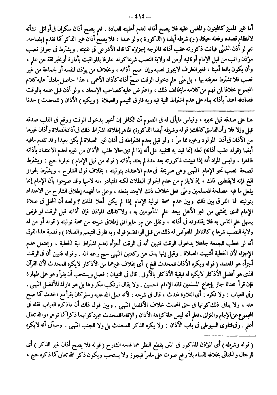 أَمَّا غَيْرُ الْمُمَيِّزِ كَالْمَجْنُونِ وَالْمُغْمَى عَلَيْهِ فَلَا يَصِحُّ أَذَانُهُ لِعَدَمِ أَهْلِيَّتِهِ لِلْعِبَادَةِ. نَعَمْ يَصِحُّ أَذَانُ سَكْرَانَ فِي أَوَائِلِ نَشْأَتِهِ لِانْتِظَامِ قَصْدِهِ وَفِعْلِهِ حِينَئِذٍ (وَ) شَرْطُهُ أَيْضًا (الذُّكُورَةُ) وَلَوْ عَبْدًا، فَلَا يَصِحُّ أَذَانُ غَيْرِ الذَّكَرِ كَمَا تَقَدَّمَ إيضَاحُهُ. نَعَمْ لَوْ أَذَّنَ الْخُنْثَى فَبَانَتْ ذُكُورَتُهُ عَقِبَ أَذَانِهِ فَالْوَجْهُ إجْزَاؤُهُ كَمَا قَالَهُ الْأَذْرَعِيُّ فِي غُنْيَتِهِ. وَيُشْتَرَطُ فِي جَوَازِ نَصْبِ مُؤَذِّنٍ رَاتِبٍ مِنْ قِبَلِ الْإِمَامِ أَوْ نَائِبِهِ أَوْ مَنْ لَهُ وِلَايَةُ النَّصْبِ شَرْعًا كَوْنُهُ عَارِفًا بِالْمَوَاقِيتِ بِأَمَارَةٍ أَوْ بِخَبَرِ ثِقَةٍ عَنْ عِلْمٍ، وَأَنْ يَكُونَ بَالِغًا أَمِينًا، فَغَيْرُ الْعَارِفِ لَا يَجُوزُ نَصْبُهُ وَإِنْ صَحَّ أَذَانُهُ، وَبِخِلَافِ مَنْ يُؤَذِّنُ لِنَفْسِهِ أَوْ لِجَمَاعَةٍ مِنْ غَيْرِ نَصْبٍ فَلَا تُشْتَرَطُ مَعْرِفَتُهُ بِهَا، بَلْ مَتَى عَلِمَ دُخُولَ الْوَقْتِ صَحَّ أَذَانُهُ كَأَذَانِ الْأَعْمَى، هَذَا حَاصِلُ مَا دَلَّ عَلَيْهِ كَلَامُ الْمَجْمُوعِ خِلَافًا لِمَنْ فَهِمَ مِنْ كَلَامِهِ مَا يُخَالِفُ ذَلِكَ، وَاعْتَرَضَ عَلَيْهِ كَصَاحِبِ الْإِسْعَادِ، وَلَوْ أَذَّنَ قَبْلَ عِلْمِهِ بِالْوَقْتِ فَصَادَفَهُ اُعْتُدَّ بِأَذَانِهِ بِنَاءً عَلَى عَدَمِ اشْتِرَاطِ النِّيَّةِ فِيهِ وَبِهِ فَارَقَ التَّيَمُّمَ وَالصَّلَاةَ