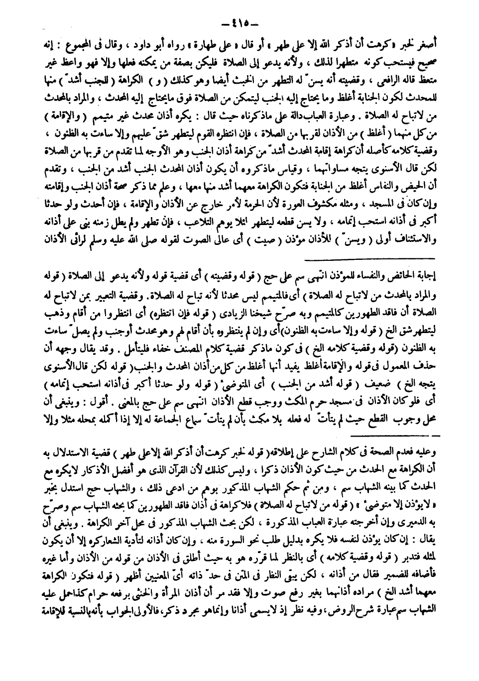(قَوْلُهُ: لِخَبَرِ «كَرِهْت أَنْ أَذْكُرَ اللَّهَ إلَّا عَلَى طُهْرٍ» ) قَضِيَّةُ الِاسْتِدْلَالِ بِهِ أَنَّ الْكَرَاهَةَ مَعَ الْحَدَثِ مِنْ حَيْثُ كَوْنُ الْأَذَانِ ذِكْرًا، وَلَيْسَ كَذَلِكَ؛ لِأَنَّ الْقُرْآنَ الَّذِي هُوَ أَفْضَلُ الْأَذْكَارِ لَا يُكْرَهُ مَعَ الْحَدَثِ كَمَا بَيَّنَهُ الشِّهَابُ سم، وَمِنْ ثَمَّ حَكَمَ الشِّهَابُ الْمَذْكُورُ بِوَهْمِ مَنْ ادَّعَى ذَلِكَ، وَالشِّهَابُ حَجّ اسْتَدَلَّ بِخَبَرِ «لَا يُؤَذِّنُ إلَّا مُتَوَضِّئٌ» (قَوْلُهُ: مَنْ لَا تُبَاحُ لَهُ الصَّلَاةُ) فَلَا كَرَاهَةَ فِي أَذَانِ فَاقِدِ الطَّهُورَيْنِ كَمَا بَحَثَهُ الشِّهَابُ سم وَصَرَّحَ بِهِ الدَّمِيرِيِّ وَإِنْ أَخْرَجَتْهُ عِبَارَةُ الْعُبَابِ الْمَذْكُورَةُ، لَكِنْ بَحَثَ الشِّهَابُ الْمَذْكُورُ فِي مَحَلٍّ آخَرَ الْكَرَاهَةَ. وَيَنْبَغِي أَنْ يُقَالَ: إنْ كَانَ يُؤَذِّنُ لِنَفْسِهِ فَلَا يُكْرَهُ بِدَلِيلِ طَلَبِ نَحْوِ السُّورَةِ مِنْهُ، وَإِنْ كَانَ أَذَانُهُ لِتَأْدِيَةِ الشِّعَارِ كُرِهَ إلَّا أَنْ يَكُونَ لِمِثْلِهِ فَتَدَبَّرْ (قَوْلُهُ: وَقَضِيَّةُ كَلَامِهِ) أَيْ بِالنَّظَرِ لِمَا قَرَّرَهُ هُوَ بِهِ حَيْثُ أَطْلَقَ فِي الْأَذَانِ مِنْ قَوْلِهِ مِنْ الْأَذَانِ وَأَمَّا غَيْرُهُ فَأَضَافَهُ لِلضَّمِيرِ فَقَالَ مِنْ أَذَانِهِ، لَكِنْ يَبْقَى النَّظَرُ فِي الْمَتْنِ فِي حَدِّ ذَاتِهِ أَيُّ الْمَعْنَيَيْنِ أَظْهَرُ (قَوْلُهُ: فَتَكُونُ الْكَرَاهَةُ مَعَهُمَا أَشَدَّ إلَخْ) مُرَادُهُ أَذَانُهُمَا بِغَيْرِ رَفْعِ صَوْتٍ وَإِلَّا فَقَدْ مَرَّ أَنَّ أَذَانَ الْمَرْأَةِ، وَالْخُنْثَى بِرَفْعِهِ حَرَامٌ كَذَا حَمَلَ عَلَيْهِ الشِّهَابُ سم عِبَارَةَ شَرْحِ الرَّوْضِ، وَفِيهِ نَظَرٌ إذْ لَا يُسَمَّى أَذَانًا وَإِنَّمَا هُوَ مُجَرَّدُ ذِكْرٍ، فَالْأَوْلَى الْجَوَابُ بِأَنَّهُ بِالنِّسْبَةِ لِلْإِقَامَةِ