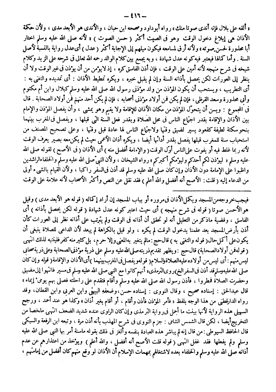 أَلْقِهِ عَلَى بِلَالٍ فَإِنَّهُ أَنْدَى صَوْتًا مِنْك» رَوَاهُ أَبُو دَاوُد وَصَحَّحَهُ ابْنُ حِبَّانَ، وَالْأَنْدَى هُوَ الْأَبْعَدُ مَدًى، لِأَنَّ حِكْمَةَ الْأَذَانِ هِيَ إبْلَاغُ دُخُولِ الْوَقْتِ وَهُوَ فِي الصِّيتِ أَكْثَرُ (حَسَنُ الصَّوْتِ) «لِأَنَّهُ - صَلَّى اللَّهُ عَلَيْهِ وَسَلَّمَ - اخْتَارَ أَبَا مَحْذُورَةَ لِحُسْنِ صَوْتِهِ» وَلِأَنَّهُ أَرَقَّ لِمَسَامِعِهِ فَيَكُونُ مَيْلُهُمْ إلَى الْإِجَابَةِ أَكْثَرَ (عَدْلٌ) أَيْ عَدْلٌ رِوَايَةً بِالنِّسْبَةِ لِأَصْلِ السُّنَّةِ. وَأَمَّا كَمَالُهَا فَيُعْتَبَرُ فِيهِ كَوْنُهُ عَدْلَ شَهَادَةٍ، وَبِهِ يَجْمَعُ بَيْنَ كَلَامِ الْوَالِدِ - رَحِمَهُ اللَّهُ تَعَالَى - فِي شَرْحِهِ عَلَى الزُّبْدِ وَكَلَامِ شَيْخِهِ فِي شَرْحِ مَنْهَجِهِ لِأَنَّهُ أَمِينٌ عَلَى الْوَقْتِ، فَإِنْ أَذَّنَ الْفَاسِقُ كُرِهَ، إذْ لَا يُؤْمَنُ مِنْ أَنْ يُؤَذِّنَ فِي غَيْرِ الْوَقْتِ وَلَا أَنْ يَنْظُرَ إلَى الْعَوْرَاتِ لَكِنْ يَحْصُلُ بِأَذَانِهِ السُّنَّةُ وَإِنْ لَمْ يُقْبَلُ خَبَرُهُ
