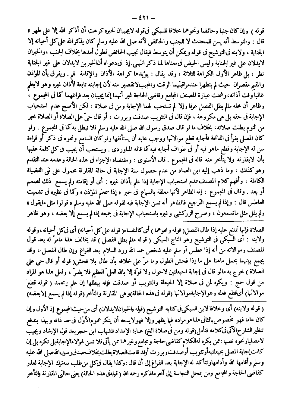 ـــــــــــــــــــــــــــــSالصَّلَاةِ فَإِنَّهَا تَمْتَنِعُ عَلَيْهِ إذَا طَالَ الْفَصْلُ (قَوْلُهُ: وَنَحْوَهُمَا) أَيْ كَالنُّفَسَاءِ (قَوْلُهُ: عَلَى كُلِّ أَحْيَانِهِ) أَيْ فِي كُلِّ أَحْيَانِهِ، وَقَوْلُهُ وَلِابْنِهِ: أَيْ السُّبْكِيّ فِي التَّوْشِيحِ وَهُوَ التَّاجُ السُّبْكِيُّ (قَوْلُهُ مَا لَمْ يَطُلْ الْفَصْلُ) قَدْ يُخَالِفُ هَذَا مَا مَرَّ لَهُ بَعْدَ قَوْلِ الْمُصَنِّفِ وَمُوَالَاتِهِ مِنْ أَنَّهُ إذَا عَطَسَ أَوْ سَلَّمَ عَلَيْهِ شَخْصٌ حَمِدَ اللَّهَ وَرَدَّ السَّلَامَ بَعْدَ الْفَرَاغِ وَإِنْ طَالَ الْفَصْلُ، وَقَدْ يَجْمَعُ بَيْنَهُمَا بِحَمْلِ مَا هُنَا عَلَى مَا إذَا فَحُشَ الطُّولُ وَمَا مَرَّ عَلَى خِلَافِهِ بِأَنْ طَالَ بِلَا فُحْشٍ (قَوْلُهُ: أَوْ قَالَ حَيَّ عَلَى الصَّلَاةِ) خَرَجَ بِهِ مَا لَوْ قَالَ فِي إجَابَةِ الْحَيْعَلَتَيْنِ لَا حَوْلَ وَلَا قُوَّةَ إلَّا بِاَللَّهِ الْعَلِيِّ الْعَظِيمِ فَلَا يَضُرُّ، وَلَعَلَّ هَذَا هُوَ الْمُرَادُ مِنْ قَوْلِ حَجّ: وَيُكْرَهُ لِمَنْ فِي صَلَاةٍ إلَّا الْحَيْعَلَةَ وَالتَّثْوِيبَ أَوْ صَدَقْت فَإِنَّهُ يُبْطِلُهَا إنْ عَلِمَ وَتَعَمَّدَ (قَوْلُهُ: قَطَعَ مُوَالَاتَهَا) أَيْ قَطَعَ فِعْلُهُ وَهُوَ الْإِجَابَةُ مُوَالَاتَهَا (قَوْلُهُ فِي هَذِهِ الْحَالَةِ) وَهِيَ الْمُقَارَنَةُ وَالتَّأَخُّرُ (قَوْلُهُ إذَا لَمْ يَسْمَعْ إلَّا بَعْضَهُ)