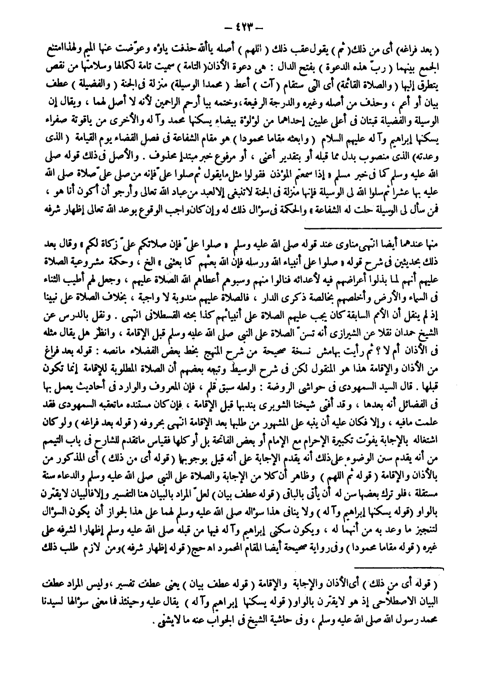 قَالَ السَّيِّدُ السَّمْهُودِيُّ فِي حَوَاشِي الرَّوْضَةِ: وَلَعَلَّهُ سَبْقُ قَلَمٍ، فَإِنَّ الْمَعْرُوفَ وَالْوَارِدَ فِي أَحَادِيثَ يُعْمَلُ بِهَا فِي الْفَضَائِلِ أَنَّهُ بَعْدَهَا، وَقَدْ أَفْتَى شَيْخُنَا الشَّوْبَرِيُّ بِنَدْبِهَا قَبْلَ الْإِقَامَةِ، فَإِنْ كَانَ مُسْتَنَدُهُ مَا تَعَقَّبَهُ السَّمْهُودِيُّ فَقَدْ عَلِمْت مَا فِيهِ، وَإِلَّا فَكَانَ عَلَيْهِ أَنْ يُنَبِّهَ عَلَى الْمَشْهُورِ مِنْ طَلَبِهَا بَعْدَ الْإِقَامَةِ انْتَهَى بِحُرُوفِهِ (قَوْلُهُ: بَعْدَ فَرَاغِهِ) وَلَوْ كَانَ اشْتِغَالُهُ بِالْإِجَابَةِ يُفَوِّتُ تَكْبِيرَةَ الْإِحْرَامِ مَعَ الْإِمَامِ أَوْ بَعْضَ الْفَاتِحَةِ بَلْ أَوْ كُلَّهَا فَقِيَاسُ مَا تَقَدَّمَ لِلشَّارِحِ فِي بَابِ التَّيَمُّمِ مِنْ أَنَّهُ يُقَدِّمُ سُنَنَ الْوُضُوءِ عَلَى ذَلِكَ أَنَّهُ يُقَدِّمُ الْإِجَابَةَ عَلَى أَنَّهُ قِيلَ بِوُجُوبِهَا (قَوْلُهُ أَيْ مِنْ ذَلِكَ) أَيْ الْمَذْكُورِ مِنْ بِالْأَذَانِ وَالْإِقَامَةِ (قَوْلُهُ: ثُمَّ اللَّهُمَّ) وَظَاهِرٌ أَنَّ كُلًّا مِنْ الْإِجَابَةِ وَالصَّلَاةِ عَلَى النَّبِيِّ - صَلَّى اللَّهُ عَلَيْهِ وَسَلَّمَ - وَالدُّعَاءِ سُنَّةٌ مُسْتَقِلَّةٌ، فَلَوْ تَرَكَ بَعْضَهَا سُنَّ لَهُ أَنْ يَأْتِيَ بِالْبَاقِي (قَوْلُهُ عَطْفُ بَيَانٍ) لَعَلَّ الْمُرَادَ بِالْبَيَانِ هُنَا التَّفْسِيرُ وَإِلَّا فَالْبَيَانُ لَا يَقْتَرِنُ بِالْوَاوِ (قَوْلُهُ: يَسْكُنُهَا إبْرَاهِيمُ وَآلُهُ) وَلَا يُنَافِي هَذَا سُؤَالُهُ - صَلَّى اللَّهُ عَلَيْهِ وَسَلَّمَ - لَهُمَا عَلَى هَذَا الْجَوَازِ أَنْ يَكُونَ السُّؤَالُ لِتَنْجِيزِ مَا وَعَدَ بِهِ مِنْ أَنَّهُمَا لَهُ، وَيَكُونُ سُكْنَى إبْرَاهِيمَ وَآلِهِ فِيهَا مِنْ قَبْلِهِ - صَلَّى اللَّهُ عَلَيْهِ وَسَلَّمَ - إظْهَارًا لِشَرَفِهِ عَلَى غَيْرِهِ (قَوْلُهُ: مَقَامًا مَحْمُودًا) وَفِي رِوَايَةٍ صَحِيحَةٍ أَيْضًا الْمَقَامَ الْمَحْمُودَ اهـ حَجّ (قَوْلُهُ: إظْهَارُ شَرَفِهِ) وَمِنْ لَازِمِ طَلَبِ ذَلِكَ