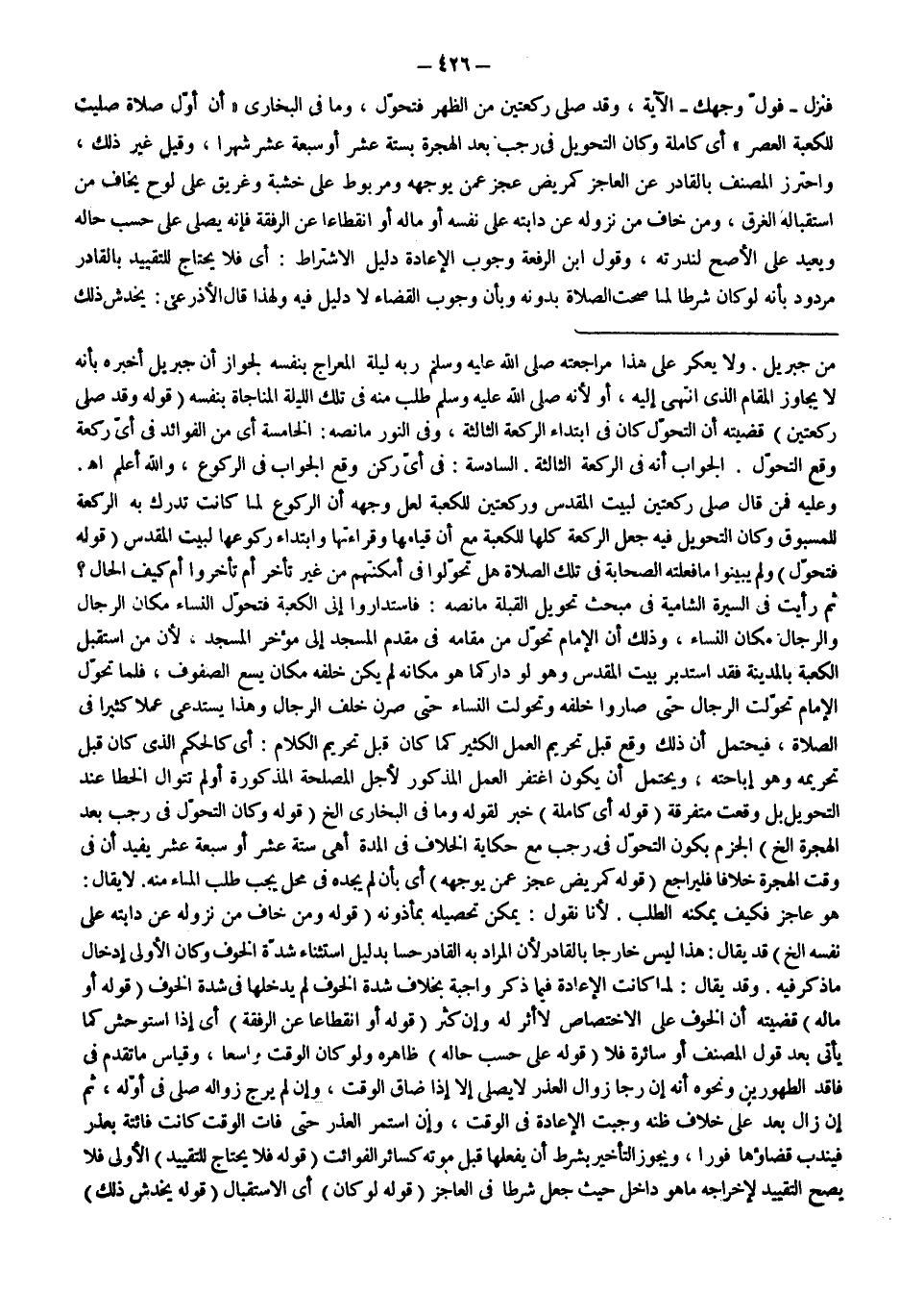 وَلَا يُعَكِّرُ عَلَى هَذَا مُرَاجَعَتُهُ - صَلَّى اللَّهُ عَلَيْهِ وَسَلَّمَ - رَبَّهُ لَيْلَةَ الْمِعْرَاجِ بِنَفْسِهِ لِجَوَازِ أَنَّ جِبْرِيلَ أَخْبَرَهُ بِأَنَّهُ لَا يُجَاوِزُ الْمَقَامَ الَّذِي انْتَهَى إلَيْهِ، أَوْ لِأَنَّهُ - صَلَّى اللَّهُ عَلَيْهِ وَسَلَّمَ - طَلَب مِنْهُ فِي تِلْكَ اللَّيْلَةِ الْمُنَاجَاةَ بِنَفْسِهِ (قَوْلُهُ: «وَقَدْ صَلَّى رَكْعَتَيْنِ» ) قَضِيَّتُهُ أَنَّ التَّحَوُّلَ كَانَ فِي ابْتِدَاءِ الرَّكْعَةِ الثَّالِثَةِ، وَفِي النُّورِ مَا نَصَّهُ: الْخَامِسَةُ أَيْ مِنْ الْفَوَائِدِ فِي أَيِّ رَكْعَةٍ وَقَعَ التَّحَوُّلُ.