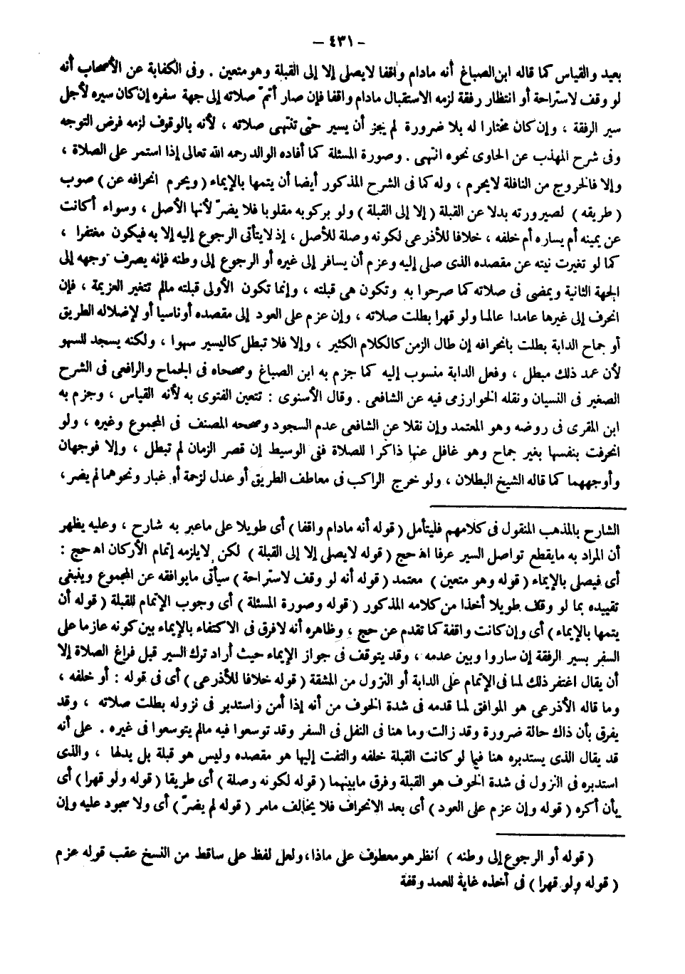 ـــــــــــــــــــــــــــــSالشَّارِحِ بِالْمَذْهَبِ الْمَنْقُولِ فِي كَلَامِهِمْ فَلْيُتَأَمَّلْ (قَوْلُهُ: أَنَّهُ مَا دَامَ وَاقِفًا) أَيْ طَوِيلًا عَلَى مَا عَبَّرَ بِهِ شَارِحٌ، وَعَلَيْهِ يَظْهَرُ أَنَّ الْمُرَادَ بِهِ مَا يَقْطَعُ تَوَاصُلَ السَّيْرِ عُرْفًا اهـ حَجّ (قَوْلُهُ: لَا يُصَلِّي إلَّا إلَى الْقِبْلَةِ) لَكِنْ لَا يَلْزَمُهُ إتْمَامُ الْأَرْكَانِ اهـ حَجّ: أَيْ فَيُصَلِّي بِالْإِيمَاءِ (قَوْلُهُ: وَهُوَ مُتَعَيِّنٌ) مُعْتَمَدٌ (قَوْلُهُ: أَنَّهُ لَوْ وَقَفَ لِاسْتِرَاحَةٍ) سَيَأْتِي مَا يُوَافِقُهُ عَنْ الْمَجْمُوعِ وَيَنْبَغِي تَقْيِيدُهُ بِمَا لَوْ وَقَفَ طَوِيلًا أَخْذًا مِنْ كَلَامِهِ الْمَذْكُورِ (قَوْلُهُ: وَصُورَةُ الْمَسْأَلَةِ) أَيْ وُجُوبِ الْإِتْمَامِ لِلْقِبْلَةِ (قَوْلُهُ أَنْ يُتِمَّهَا بِالْإِيمَاءِ) أَيْ وَإِنْ كَانَتْ وَاقِفَةً كَمَا تَقَدَّمَ عَنْ حَجّ، وَظَاهِرُهُ أَنَّهُ لَا فَرْقَ فِي الِاكْتِفَاءِ بِالْإِيمَاءِ بَيْنَ كَوْنِهِ عَازِمًا عَلَى السَّفَرِ بِسَيْرِ الرِّفْقَةِ إنْ سَارُوا وَبَيْنَ عَدَمِهِ، وَقَدْ يَتَوَقَّفُ فِي جَوَازِ الْإِيمَاءِ حَيْثُ أَرَادَ تَرْكَ السَّيْرِ قَبْلَ فَرَاغِ الصَّلَاةِ إلَّا أَنْ يُقَالَ اُغْتُفِرَ ذَلِكَ لِمَا فِي الْإِتْمَامِ عَلَى الدَّابَّةِ أَوْ النُّزُولِ مِنْ الْمَشَقَّةِ (قَوْلُهُ: خِلَافًا لِلْأَذْرَعِيِّ) أَيْ فِي قَوْلِهِ: أَوْ خَلْفِهِ، وَمَا قَالَهُ الْأَذْرَعِيُّ هُوَ الْمُوَافِقُ لِمَا قَدَّمَهُ فِي شِدَّةِ الْخَوْفِ مِنْ أَنَّهُ إذَا أَمِنَ وَاسْتَدْبَرَ فِي نُزُولِهِ بَطَلَتْ صَلَاتُهُ، وَقَدْ يُفَرِّقُ بِأَنَّ ذَاكَ حَالَةُ ضَرُورَةٍ وَقَدْ زَالَتْ وَمَا هُنَا فِي النَّفْلِ فِي السَّفَرِ وَقَدْ تَوَسَّعُوا فِيهِ مَا لَمْ يَتَوَسَّعُوا فِي غَيْرِهِ.