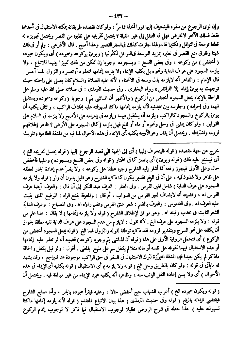 لِأَنَّا نَقُولُ: لَا يَلْزَمُ مِنْ عَدَمِ السُّجُودِ عَلَى عُرْفِ الدَّابَّةِ نَفْيُهُ مُطْلَقًا لِجَوَازِ أَنْ يُكَلِّفَهُ عَلَى نَحْوِ السَّرْجِ وَبِتَقْدِيرِ لُزُومِهِ فَقَدْ ذَكَرَهُ تَوْطِئَةً لِقَوْلِهِ وَالنُّزُولُ لَهُمَا إلَخْ (قَوْلُهُ: يَجْعَلُ السُّجُودَ أَخْفَضَ مِنْ الرُّكُوعِ) أَيْ فَتُحْمَلُ الرِّوَايَةُ الْأُولَى عَلَى هَذَا (قَوْلُهُ: أَنَّ الْمَاشِي يُتِمُّ وُجُوبًا رُكُوعَهُ) قَضِيَّتُهُ أَنَّهُ لَوْ تَعَذَّرَ عَلَيْهِ إتْمَامُهَا أَوْ عَدَمُ الِاسْتِقْبَالِ فِيهِمَا لِخَوْفِهِ عَلَى نَفْسِهِ أَوْ مَالِهِ مَثَلًا لَمْ يَنْتَفِلْ سم عَلَى مَنْهَجٍ بِالْمَعْنَى. أَقُولُ: وَلَوْ قِيلَ يَتَنَفَّلُ وَالْحَالَةُ مَا ذُكِرَ لَمْ يَكُنْ بَعِيدًا فَإِنَّ الْمَشَقَّةَ الْمُجَوِّزَةُ لِتَرْكِ الِاسْتِقْبَالِ فِي السَّفَرِ فِي حَقِّ الرَّاكِبِ مَوْجُودَةٌ هُنَا فَلْيُرَاجَعْ، وَقَدْ يَشْهَدُ لَهُ مَا يَأْتِي فِي قَوْلِهِ: وَلَوْ كَانَ بِالطَّرِيقِ وَحَلَّ إلَخْ (قَوْلُهُ: وَلَا يَلْزَمُهُ) أَيْ الِاسْتِقْبَالُ