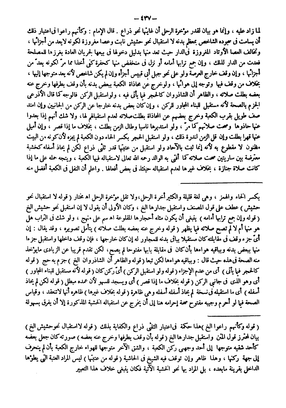 ـــــــــــــــــــــــــــــSبِكَسْرِ الْخَاءِ وَالْهَمْزِ، وَهِيَ لُغَةٌ قَلِيلَةٌ وَالْكَثِيرُ آخِرَةُ الرَّحْلِ، وَلَا تَقُلْ مُؤَخِّرَةُ الرَّحْلِ اهـ مُخْتَارٌ (قَوْلُهُ: لَا اسْتِقْبَالَ نَحْوَ حَشِيشٍ) عَطْفٌ عَلَى قَوْلِ الْمُصَنِّفِ وَاسْتَقْبَلَ جِدَارَهَا إلَخْ، وَكَانَ الْأَوْلَى أَنْ يَقُولَ لَا إنْ اسْتَقْبَلَ نَحْوَ حَشِيشٍ إلَخْ (قَوْلُهُ: وَإِنْ جَمَعَ تُرَابَهَا أَمَامَهُ) يَنْبَغِي أَنْ يَكُونَ مِثْلُهُ أَحْجَارَهَا الْمَقْلُوعَةَ اهـ سم عَلَى مَنْهَجٍ، وَلَوْ شَكَّ فِي التُّرَابِ هَلْ هُوَ مِنْهَا أَمْ لَا لَمْ تَصِحَّ صَلَاتُهُ فِيمَا يَظْهَرُ (قَوْلُهُ وَخَرَجَ عَنْهُ بَعْضُهُ بَطَلَتْ صَلَاتُهُ) يُتَأَمَّلْ تَصْوِيرُهُ، وَقَدْ يُقَالُ: إنَّ أَيَّ جُزْءٍ وَقَفَ فِي مُقَابَلَتِهِ كَانَ مُسْتَقْبِلًا بِبَاقِي بَدَنِهِ لِلْمُجَاوِرِ لَهُ إنْ كَانَ خَارِجَهَا، فَإِنْ وَقَفَ دَاخِلَهَا وَاسْتَقْبَلَ جُزْءًا مِنْهَا بِبَعْضِ بَدَنِهِ وَبِبَاقِيهِ هَوَاءَهَا بِأَنْ كَانَ فِي مُقَابَلَةِ بَابِهَا مَفْتُوحًا لَمْ يَصِحَّ، لَكِنْ تَقَدَّمَ قَرِيبًا عَنْ الزِّيَادِيِّ مَا يُؤْخَذُ مِنْهُ الصِّحَّةُ فِي هَذِهِ حَيْثُ قَالَ: وَبِبَاقِيهِ هَوَاءَهَا لَكِنْ تَبَعًا (قَوْلُهُ: وَالظَّاهِرُ أَنَّ الشَّاذَرْوَانَ إلَخْ) جَزَمَ بِهِ حَجّ (قَوْلُهُ كَالْحَجَرِ فِيمَا يَأْتِي) أَيْ مِنْ عَدَمِ الْإِجْزَاءِ (قَوْلُهُ وَلَوْ اسْتَقْبَلَ الرُّكْنَ) أَيَّ رُكْنٍ كَانَ (قَوْلُهُ: لِأَنَّهُ مُسْتَقْبِلٌ لِلْبِنَاءِ الْمُجَاوِرِ) أَيْ وَهُوَ الَّذِي فِي جَانِبَيْ الرُّكْنِ (قَوْلُهُ: بِخِلَافِ مَا إذَا قَصُرَ) أَيْ وَيَسْجُدُ لِلسَّهْوِ لِأَنَّ عَمْدَهُ مُبْطِلٌ