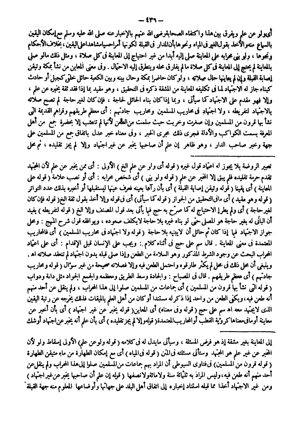 ـــــــــــــــــــــــــــــQإلَى الْمُعَايَنَةِ بِغَيْرِ مَشَقَّةٍ إذْ هُوَ فَرْضُ الْمَسْأَلَةِ، وَسَيَأْتِي مَا يَدُلُّ لَهُ فِي كَلَامِهِ (قَوْلُهُ: وَلَوْ عَنْ عِلْمٍ) الْأَوْلَى إسْقَاطُ وَلَوْ؛ لِأَنَّ الْمُخْبِرَ عَنْ غَيْرِ عِلْمٍ هُوَ الْمُجْتَهِدُ وَسَتَأْتِي مَسْأَلَتُهُ فِي الْمَتْنِ (قَوْلُهُ: فِي الْمِيَاهِ) أَيْ مَعَ إمْكَانِ الطَّهَارَةِ مِنْ مَاءٍ مُتَيَقَّنِ الطَّهَارَةِ (قَوْلُهُ: قُرُونٌ مِنْ الْمُسْلِمِينَ) فِي فَتَاوَى السُّيُوطِيّ أَنَّ الْمُرَادَ بِهِمْ جَمَاعَاتٌ مِنْ الْمُسْلِمِينَ صَلُّوا إلَى هَذَا الْمِحْرَابِ وَلَمْ يُنْقَلْ عَنْ أَحَدٍ مِنْهُمْ أَنَّهُ طَعَنَ فِيهِ، وَلَيْسَ الْمُرَادُ بِهِ ثَلَثَمِائَةِ سَنَةٍ وَلَا مِائَةً وَلَا نِصْفَهَا (قَوْلُهُ: إنْ عَلِمَ أَنَّ صَاحِبَهَا يُخْبِرُ عَنْ غَيْرِ اجْتِهَادٍ) وَمِنْ غَيْرِ الِاجْتِهَادِ أَخْذًا مِمَّا قَبْلَهُ اسْتِنَادُ إخْبَارِهِ إلَى اتِّفَاقِ أَهْلِ الْبَلَدِ عَلَى جِهَاتِهَا وَأَوْضَاعِهَا الْمَعْلُومِ مِنْهُ جِهَةُ الْقِبْلَةِ