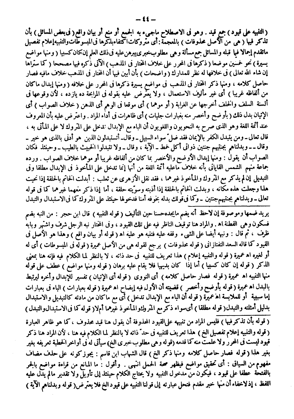 وَالْمُرَادُ هُنَا تَوْقِيفُ النَّاظِرِ فِيهِ عَلَى تِلْكَ الْقُيُودِ، وَفِي الْمُخْتَارِ نَبِهَ الرَّجُلُ شَرُفَ وَاشْتَهَرَ وَبَابُهُ ظَرُفَ، ثُمَّ قَالَ: وَنَبَّهَهُ أَيْضًا عَلَى الشَّيْءِ وَقَفَهُ عَلَيْهِ فَتَنَبَّهَ هُوَ عَلَيْهِ اهـ (قَوْلُهُ: أَوْ بَيَانٍ وَاقِعٍ) وَهَذَا هُوَ الْأَصْلُ فِي الْقُيُودِ كَمَا قَالَهُ السَّعْدُ التَّفْتَازَانِيُّ (قَوْلُهُ: مَحْذُوفَاتٌ) يَرْجِعُ لِقَوْلِهِ هِيَ مِنْ الْأَصْلِ عَمِيرَةُ (قَوْلُهُ فِي الْمَبْسُوطَاتِ) أَيْ لَهُ أَوْ لِغَيْرِهِ اهـ عَمِيرَةُ (قَوْلُهُ: وَالتَّنْبِيهُ إعْلَامٌ) هَذَا تَعْرِيفٌ لِلتَّنْبِيهِ فِي حَدِّ ذَاتِهِ، لَا بِالنَّظَرِ لِمَا الْكَلَامُ فِيهِ فَإِنَّهُ هُنَا بِمَعْنَى الذِّكْرِ (قَوْلُهُ: إنْ كَانَ كَسْبِيًّا) أَمَّا إذَا كَانَ بَدِيهِيًّا فَلَا يُقَامُ عَلَيْهِ بُرْهَانٌ (قَوْلُهُ وَمِنْهَا مَوَاضِعُ) عَطْفٌ عَلَى قَوْلِهِ مِنْهَا التَّنْبِيهُ اهـ عَمِيرَةُ (قَوْلُهُ: فَصَارَ حَاصِلُ كَلَامِهِ) أَيْ النَّوَوِيِّ (قَوْلُهُ: أَيْ الْإِتْيَانُ) تَفْسِيرٌ لِلْإِبْدَالِ وَأَخَّرَهُ لِيَرْتَبِطَ بِالْبَدَلِ اهـ عَمِيرَةُ (قَوْلُهُ: بِأَوْضَحَ وَأَخْصَرَ) قَضِيَّتُهُ أَنَّ الْأَوَّلَ فِيهِ إيضَاحٌ اهـ عَمِيرَةُ (قَوْلُهُ: بِعِبَارَاتٍ) الْبَاءُ فِي بِعِبَارَاتٍ إمَّا سَبَبِيَّةٌ أَوْ لِلْمُلَابَسَةِ اهـ عَمِيرَةُ (قَوْلُهُ: أَنَّ الْبَاءَ مَعَ الْإِبْدَالِ تَدْخُلُ) أَيْ مَعَ مَا كَانَ مِنْ مَادَّتِهِ كَالتَّبْدِيلِ وَالِاسْتِبْدَالِ بِدَلِيلِ أَمْثِلَتِهِ وَالتَّبَدُّلِ (قَوْلُهُ: مُطْلَقًا) أَيْ سَوَاءٌ ذُكِرَ مَعَ الْمَتْرُوكِ وَالْمَأْخُوذِ غَيْرُهُمَا أَمْ لَا (قَوْلُهُ: كَمَا فِي الِاسْتِبْدَالِ وَالتَّبَدُّلِ)