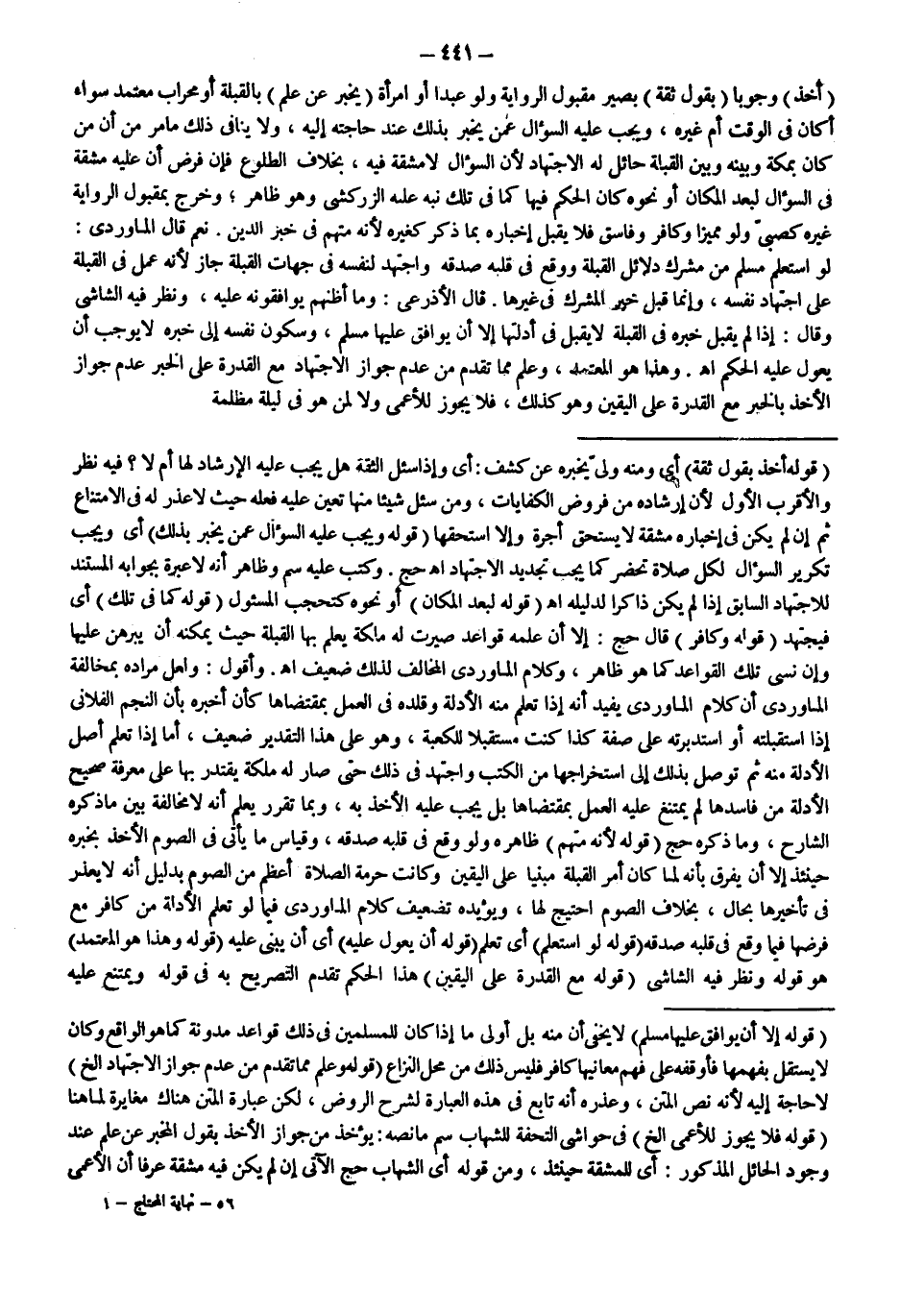 وَهَذَا هُوَ الْمُعْتَمَدُ، وَعُلِمَ مِمَّا تَقَدَّمَ مِنْ عَدَمِ جَوَازِ الِاجْتِهَادِ مَعَ الْقُدْرَةِ عَلَى الْخَبَرِ عَدَمُ جَوَازِ الْأَخْذِ بِالْخَبَرِ مَعَ الْقُدْرَةِ عَلَى الْيَقِينِ وَهُوَ كَذَلِكَ، فَلَا يَجُوزُ لِلْأَعْمَى وَلَا لِمَنْ هُوَ فِي لَيْلَةٍ مُظْلِمَةٍ