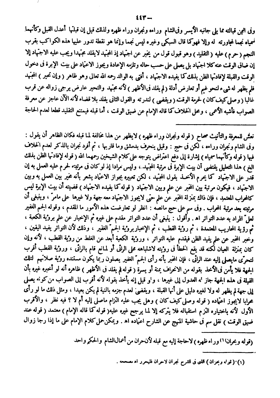 وَفِي الْيَمِينِ قُبَالَتُهُ مِمَّا يَلِي جَانِبَهُ الْأَيْسَرَ وَفِي الشَّامِ وَرَاءَهُ وَنَجْرَانَ وَرَاءَ ظَهْرِهِ وَلِذَلِكَ قِيلَ إنَّ قِبْلَتَهَا أَعْدَلُ الْقِبَلِ وَكَأَنَّهُمَا سَمَّيَاهُ نَجْمًا لِمُجَاوَرَتِهِ لَهُ وَإِلَّا فَهُوَ كَمَا قَالَ السُّبْكِيُّ وَغَيْرُهُ لَيْسَ نَجْمًا وَإِنَّمَا هُوَ نُقْطَةٌ تَدُورُ عَلَيْهَا هَذِهِ الْكَوَاكِبُ بِقُرْبِ النَّجْمِ (حُرِّمَ) عَلَيْهِ (التَّقْلِيدُ) وَهُوَ قَبُولُ قَوْلِ مَنْ يُخْبِرُ عَنْ اجْتِهَادٍ إذْ الْمُجْتَهِدُ لَا يُقَلِّدُ مُجْتَهِدًا وَيَجِبُ عَلَيْهِ الِاجْتِهَادُ إلَّا إنْ ضَاقَ الْوَقْتُ عَنْهُ كَلَا اجْتِهَادٍ بَلْ يُصَلِّي عَلَى حَسَبِ حَالِهِ وَتَلْزَمُهُ الْإِعَادَةُ وَيَجُوزُ الِاعْتِمَادُ عَلَى بَيْتِ الْإِبْرَةِ فِي دُخُولِ الْوَقْتِ وَالْقِبْلَةِ لِإِفَادَتِهَا الظَّنِّ بِذَلِكَ كَمَا يُفِيدُهُ الِاجْتِهَادُ، أَفْتَى بِهِ الْوَالِدُ - رَحِمَهُ اللَّهُ تَعَالَى - وَهُوَ ظَاهِرٌ.
