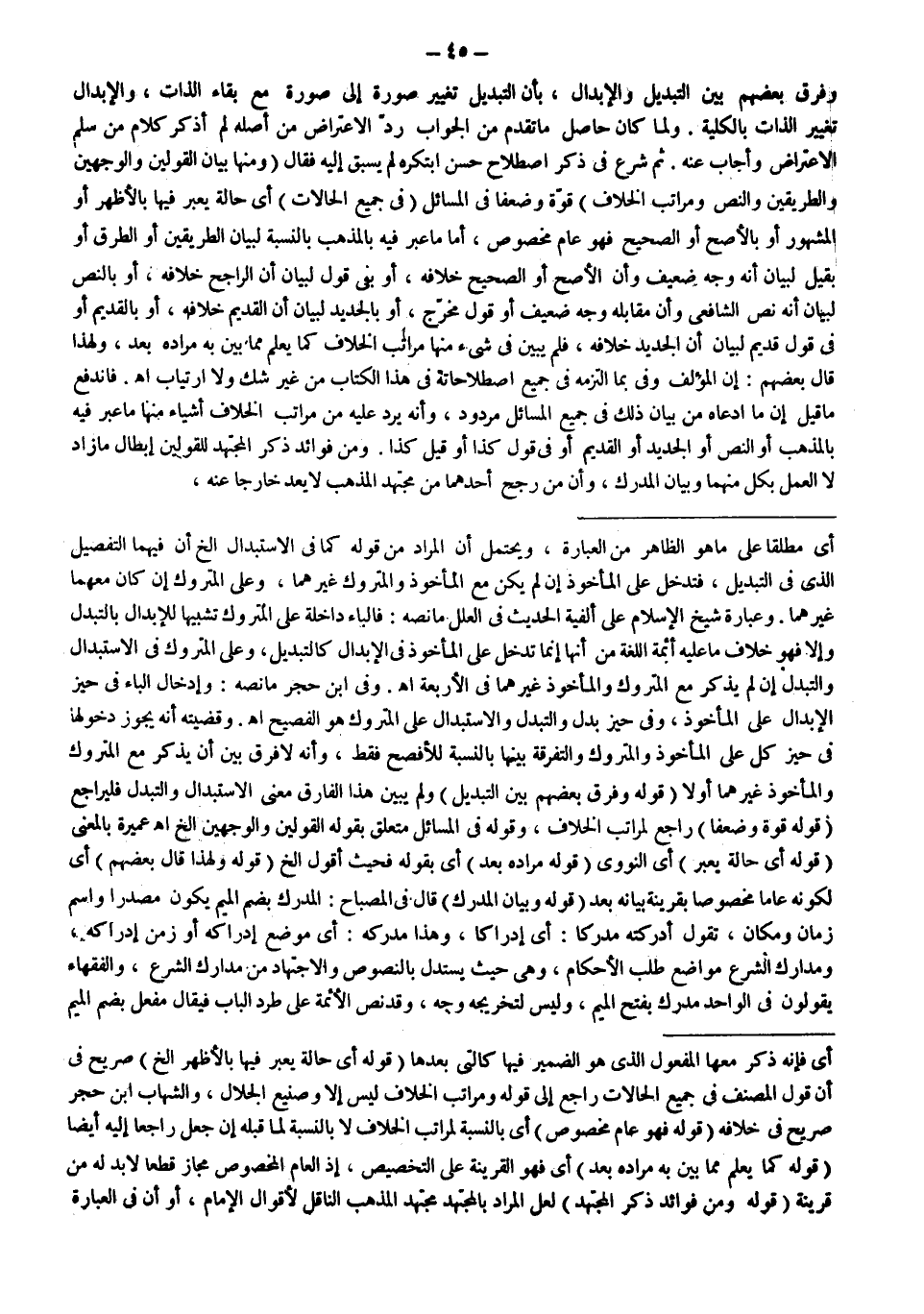 وَفَرَّقَ بَعْضُهُمْ بَيْنَ التَّبْدِيلِ وَالْإِبْدَالِ، بِأَنَّ التَّبْدِيلَ تَغْيِيرُ صُورَةٍ إلَى صُورَةٍ مَعَ بَقَاءِ الذَّاتِ، وَالْإِبْدَالُ تَغْيِيرُ الذَّاتِ بِالْكُلِّيَّةِ. وَلَمَّا كَانَ حَاصِلُ مَا تَقَدَّمَ مِنْ الْجَوَابِ رَدَّ الِاعْتِرَاضِ مِنْ أَصْلِهِ لَمْ أَذْكُرْ كَلَامَ مَنْ سَلَّمَ الِاعْتِرَاضَ وَأَجَابَ عَنْهُ. ثُمَّ شَرَعَ فِي ذِكْرِ اصْطِلَاحٍ حَسَنٍ ابْتَكَرَهُ لَمْ يُسْبَقْ إلَيْهِ فَقَالَ (وَمِنْهَا بَيَانُ الْقَوْلَيْنِ وَالْوَجْهَيْنِ وَالطَّرِيقَيْنِ وَالنَّصِّ وَمَرَاتِبِ الْخِلَافِ) قُوَّةً وَضَعْفًا فِي الْمَسَائِلِ (فِي جَمِيعِ الْحَالَاتِ) أَيْ حَالَةَ يُعَبِّرُ فِيهَا بِالْأَظْهَرِ أَوْ الْمَشْهُورِ أَوْ بِالْأَصَحِّ أَوْ الصَّحِيحِ فَهُوَ عَامٌّ مَخْصُوصٌ، أَمَّا مَا عَبَّرَ فِيهِ بِالْمَذْهَبِ بِالنِّسْبَةِ لِبَيَانِ الطَّرِيقَيْنِ أَوْ الطُّرُقِ أَوْ بِقِيلٍ لِبَيَانِ أَنَّهُ وَجْهٌ ضَعِيفٌ وَأَنَّ الْأَصَحَّ أَوْ الصَّحِيحَ خِلَافُهُ، أَوْ بَقِيَ قَوْلٌ لِبَيَانِ أَنَّ الرَّاجِحَ خِلَافُهُ، أَوْ بِالنَّصِّ لِبَيَانِ أَنَّهُ نَصُّ الشَّافِعِيِّ وَأَنَّ مُقَابِلَهُ وَجْهٌ ضَعِيفٌ أَوْ قَوْلٌ مُخَرَّجٌ، أَوْ بِالْجَدِيدِ لِبَيَانِ أَنَّ الْقَدِيمَ خِلَافُهُ، أَوْ بِالْقَدِيمِ أَوْ فِي قَوْلٍ قَدِيمٍ لِبَيَانِ أَنَّ الْجَدِيدَ خِلَافُهُ، فَلَمْ يُبَيِّنْ فِي شَيْءٍ مِنْهَا مَرَاتِبَ الْخِلَافِ كَمَا يُعْلَمُ مِمَّا بَيَّنَ بِهِ مُرَادَهُ بَعْدُ، وَلِهَذَا قَالَ بَعْضُهُمْ: إنَّ الْمُؤَلِّفَ وَفِيٌّ بِمَا الْتَزَمَهُ فِي جَمِيعِ اصْطِلَاحَاتِهِ فِي هَذَا الْكِتَابِ مِنْ غَيْرِ شَكٍّ وَلَا ارْتِيَابٍ اهـ.