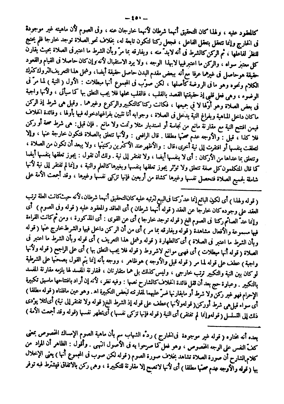 كَالْمَعْقُودِ عَلَيْهِ، وَلِهَذَا كَانَ التَّحْقِيقُ أَنَّهُمَا شَرْطَانِ لِأَنَّهُمَا خَارِجَانِ عَنْهُ، وَفِي الصَّوْمِ لِأَنَّ مَاهِيَّتَهُ غَيْرُ مَوْجُودَةٍ فِي الْخَارِجِ وَإِنَّمَا تَتَعَقَّلُ بِتَعَقُّلِ الْفَاعِلِ، فَجُعِلَ رُكْنًا لِتَكُونَ تَابِعَةً لَهُ، بِخِلَافِ نَحْوِ الصَّلَاةِ تُوجَدُ خَارِجًا فَلَمْ يَحْتَجْ لِلنَّظَرِ لِفَاعِلِهَا، ثُمَّ الرُّكْنُ كَالشَّرْطِ فِي أَنَّهُ لَا بُدَّ مِنْهُ، وَيُفَارِقُهُ بِمَا مَرَّ وَبِأَنَّ الشَّرْطَ مَا اُعْتُبِرَ فِي الصَّلَاةِ بِحَيْثُ يُقَارِنُ كُلَّ مُعْتَبَرٍ سِوَاهُ، وَالرُّكْنُ مَا اُعْتُبِرَ فِيهَا لَا بِهَذَا الْوَجْهِ، وَلَا يَرِدُ الِاسْتِقْبَالُ لِأَنَّهُ وَإِنْ كَانَ حَاصِلًا فِي الْقِيَامِ وَالْقُعُودِ حَقِيقَةً هُوَ حَاصِلٌ فِي غَيْرِهِمَا عُرْفًا مَعَ أَنَّهُ بِبَعْضِ مُقَدَّمِ الْبَدَنِ حَاصِلٌ حَقِيقَةً أَيْضًا، وَشَمِلَ هَذَا التَّعْرِيفُ التَّوَرُّكَ كَتَرْكِ الْكَلَامِ وَنَحْوِهِ وَهُوَ مَا فِي الرَّوْضَةِ كَأَصْلِهَا، لَكِنْ صَوَّبَ فِي الْمَجْمُوعِ أَنَّهَا مُبْطِلَاتٌ:
