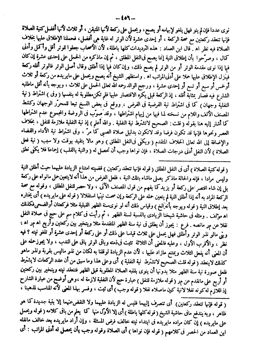 نَوَى عَدَدًا فَإِنْ لَمْ يَنْوِ فَهَلْ يَلْغُو لِإِبْهَامِهِ أَوْ يَصِحُّ، وَيُحْمَلُ عَلَى رَكْعَةٍ لِأَنَّهَا الْمُتَيَقَّنُ، أَوْ ثَلَاثٌ لِأَنَّهَا أَفْضَلُ كَنِيَّةِ الصَّلَاةِ فَإِنَّهَا تَنْعَقِدُ رَكْعَتَيْنِ مَعَ صِحَّةِ الرَّكْعَةِ، أَوْ إحْدَى عَشْرَةَ لِأَنَّ الْوِتْرَ لَهُ غَايَةٌ هِيَ أَفْضَلُ، فَحَمَلْنَا الْإِطْلَاقَ عَلَيْهَا بِخِلَافِ الصَّلَاةِ فِيهِ نَظَرٌ اهـ. قَالَ ابْنُ الْعِمَادِ: هَذِهِ التَّرْدِيدَاتُ كُلُّهَا بَاطِلَةٌ، لِأَنَّ الْأَصْحَابَ جَعَلُوا لِلْوِتْرِ أَقَلَّ وَأَكْمَلَ وَأَدْنَى كَمَالٍ، وَصَرَّحُوا بِأَنَّ إطْلَاقَ النِّيَّةِ إنَّمَا يَصِحُّ فِي النَّفْلِ الْمُطْلَقِ، ثُمَّ إنَّ مَا ذَكَرَهُ مِنْ الْحَمْلِ عَلَى إحْدَى عَشْرَةَ إنْ كَانَ فِيمَا إذَا نَوَى مُقَدِّمَةَ الْوِتْرِ أَوْ مِنْ الْوِتْرِ لَمْ يَصِحَّ ذَلِكَ، وَإِنْ كَانَ فِيمَا إذَا أَطْلَقَ وَقَالَ أُصَلِّي الْوِتْرَ فَالْوِتْرُ أَقَلُّهُ رَكْعَةٌ فَيَنْزِلُ الْإِطْلَاقُ عَلَيْهَا حَمْلًا عَلَى أَدْنَى الْمَرَاتِبِ اهـ.