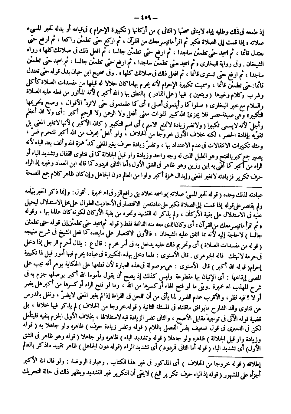 أَقُولُ: وَإِنَّمَا ذَكَرَ الْخَبَرَ بِتَمَامِهِ وَلَمْ يَقْتَصِرْ عَلَى قَوْلِهِ إذَا قُمْت إلَى الصَّلَاةِ فَكَبِّرْ عَلَى عَادَتِهِ مِنْ الِاقْتِصَارِ فِي الْأَحَادِيثِ الطِّوَالِ عَلَى مَحَلِّ الِاسْتِدْلَالِ لِيُحِيلَ عَلَيْهِ فِي الِاسْتِدْلَالِ عَلَى بَقِيَّةِ الْأَرْكَانِ، وَلَمْ يَذْكُرْ لَهُ التَّشَهُّدَ وَنَحْوَهُ مِنْ بَقِيَّةِ الْأَرْكَانِ لِكَوْنِهِ كَانَ عَالِمًا بِهَا، وَقَوْلُهُ «ثُمَّ اقْرَأْ مَا تَيَسَّرَ مَعَكَ مِنْ الْقُرْآنِ» أَيْ وَكَانَ الَّذِي مَعَهُ مِنْهُ الْفَاتِحَةُ فَقَطْ (قَوْلُهُ: ثُمَّ اُسْجُدْ حَتَّى تَطْمَئِنَّ إلَى قَوْلِهِ حَتَّى تَطْمَئِنَّ جَالِسًا) لَا حَاجَةَ إلَيْهِ لِأَنَّهُ مِمَّا اتَّفَقَ عَلَيْهِ الشَّيْخَانِ، فَالْأَوْلَى الِاقْتِصَارُ عَلَى مَا بَعْدَهُ كَمَا فَعَلَ الشَّيْخُ فِي شَرْحِ مَنْهَجِهِ (قَوْلُهُ: مِنْ مُفْسِدَاتِ الصَّلَاةِ) أَيْ وَتَحْرِيمُ ذَلِكَ عَلَيْهِ يَدْخُلُ بِهِ فِي أَمْرٍ مُحَرَّمٍ: قَالَ ع: يُقَالُ أَحْرَمَ الرَّجُلُ إذَا دَخَلَ فِي حُرْمَةٍ لَا تُهْتَكُ قَالَهُ الْجَوْهَرِيُّ.