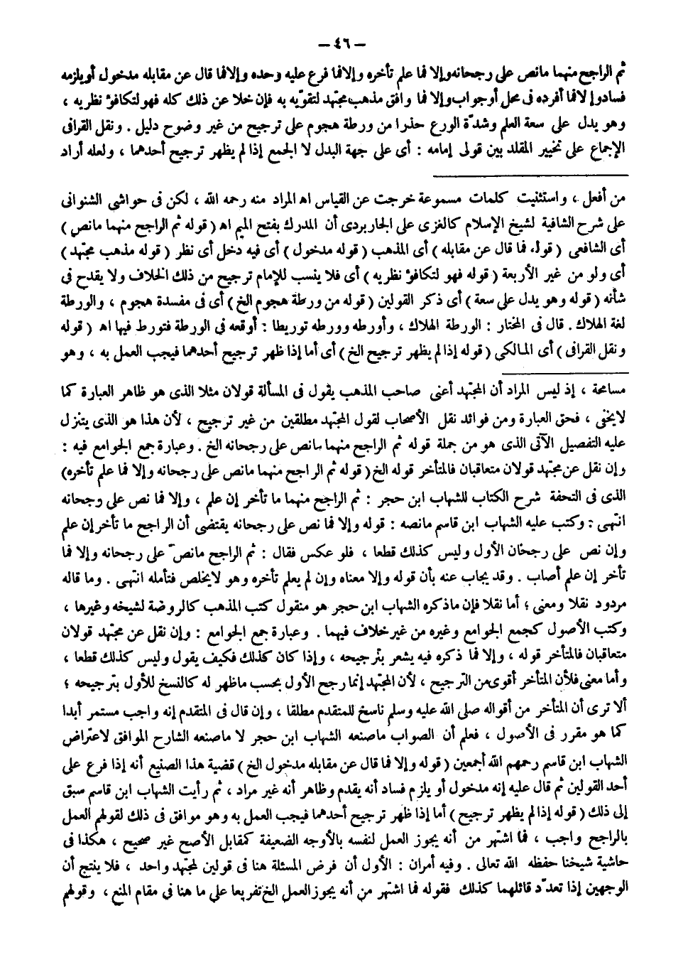 ثُمَّ الرَّاجِحُ مِنْهُمَا مَا نَصَّ عَلَى رُجْحَانِهِ وَإِلَّا فَمَا عُلِمَ تَأَخُّرُهُ وَإِلَّا فَمَا فَرَّعَ عَلَيْهِ وَحْدَهُ وَإِلَّا فَمَا قَالَ عَنْ مُقَابِلِهِ مَدْخُولٌ أَوْ يَلْزَمُهُ فَسَادٌ وَإِلَّا فَمَا أَفْرَدَهُ فِي مَحَلٍّ أَوْ جَوَابٍ وَإِلَّا فَمَا وَافَقَ مَذْهَبَ مُجْتَهِدٍ لِتَقَوِّيهِ بِهِ فَإِنْ خَلَا عَنْ ذَلِكَ كُلِّهِ فَهُوَ لِتَكَافُؤِ نَظَرَيْهِ، وَهُوَ يَدُلُّ عَلَى سَعَةِ الْعِلْمِ وَشِدَّةِ الْوَرَعِ حَذَرًا مِنْ وَرْطَةِ هُجُومٍ عَلَى تَرْجِيحٍ مِنْ غَيْرِ وُضُوحِ دَلِيلٍ. وَنَقَلَ الْقَرَافِيُّ الْإِجْمَاعَ عَلَى تَخْيِيرِ الْمُقَلِّدِ بَيْنَ قَوْلَيْ إمَامِهِ: أَيْ عَلَى جِهَةِ الْبَدَلِ لَا الْجَمْعِ إذَا لَمْ يَظْهَرْ تَرْجِيحُ أَحَدِهِمَا، وَلَعَلَّهُ أَرَادَ